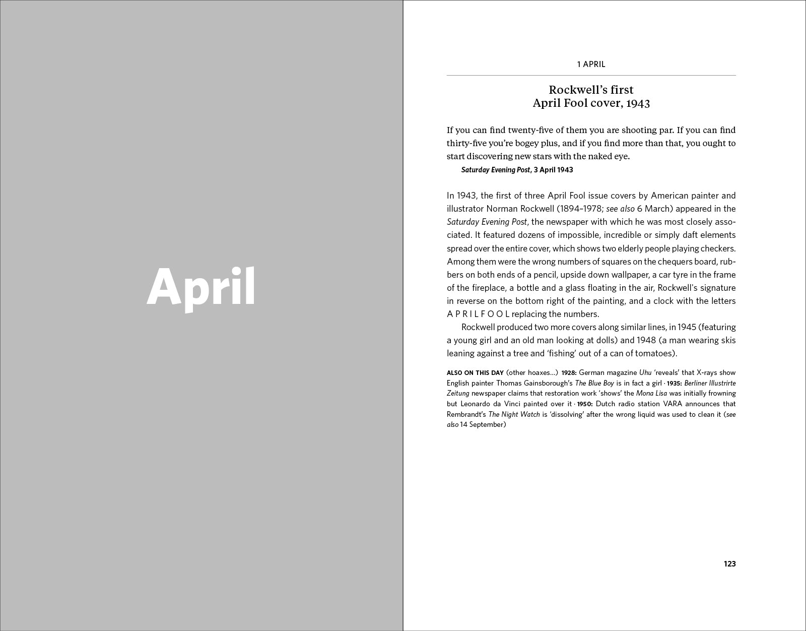 Each day has its own section, starting with an extended quote giving artists, critics and commentators their voice to speak directly to us, followed by a brief explanatory text, and ending with other important events in art on that day e.g. births, deaths and exhibition openings. Not every entry is momentous, but all are significant. Yes, there are thefts, murders, artistic mishaps and eureka moments, but there are also more relatable episodes such as President Theodore Roosevelt's doodles, Michelangelo writing to his nephew about his kidney stones and Monet getting the green light for his water garden. Every day has a story to tell.