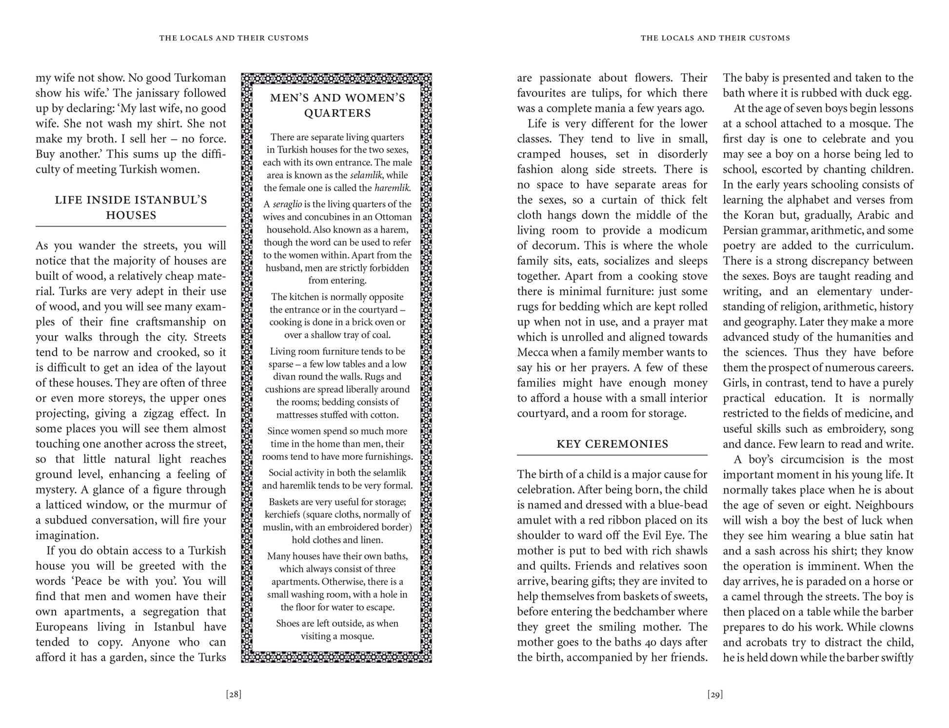 This entertaining and informative guide takes you on a journey back to the era of the Grand Tour, when Istanbul was a favourite destination for enterprising travellers. Learn how to gain access to the heavily guarded Topkapi Sarayi. Discover how to haggle with the expert salesmen in the bustling bazaars, learn what excitements await you in a Turkish bath and attend the strange rituals of the whirling dervishes. Or watch the sultan, dressed in all his finery, taking to the Bosphorus in his splendid barge. The more daring can join the crowds attending an execution or taste the forbidden delicacies on offer in the most risque coffee houses and opium dens.