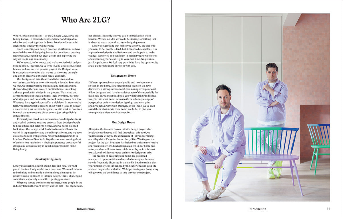 Jordan Cluroe and Russell Whitehead's London-based interior design practice 2LG Studio was founded in 2013, following Jordan's appearance as a contestant on the BBC's Great Interior Design Challenge. The studio's designs have been featured in Casa Vogue, Elle Decoration, Harper's Bazaar, Living Etc, Grand Designs and on Channel 4 and ITV. Jordan and Russell have also collaborated with a number of leading brands, including Ligne Roset, Natuzzi, Secret Linen Store, Brintons Carpets, Floor Story and Graham & Brown. Their column 'The House Doctors' appears in London's Metro, and they have recently joined Channel 4's Changing Rooms.