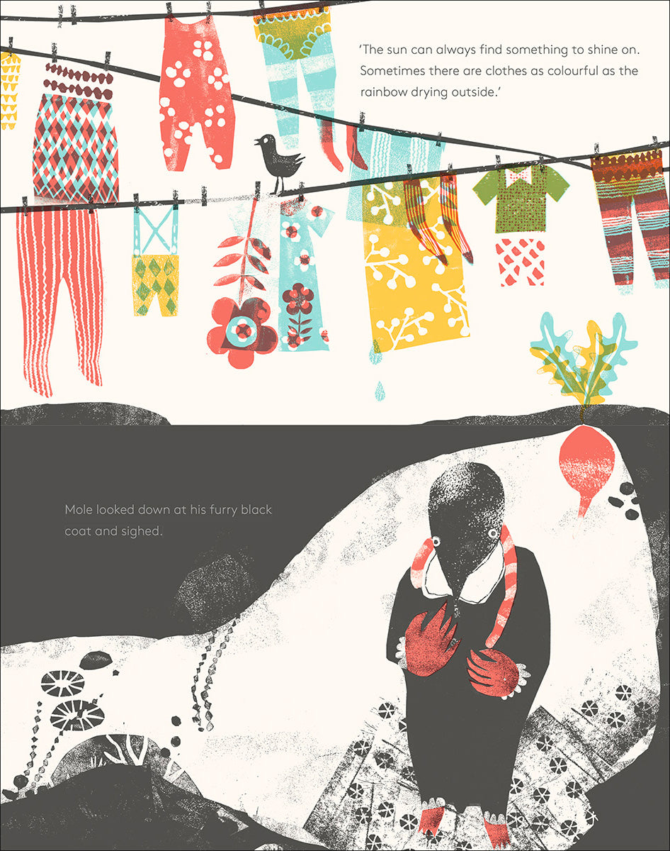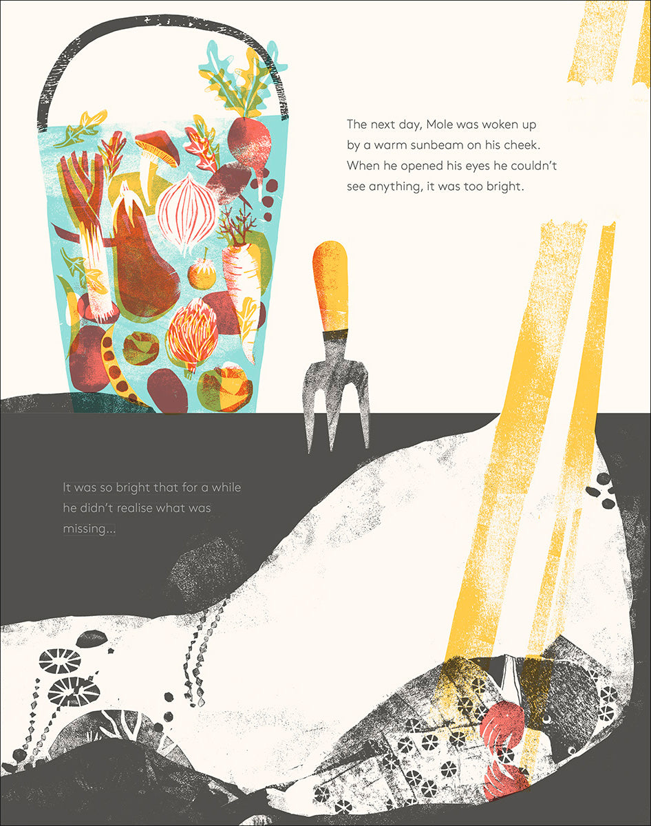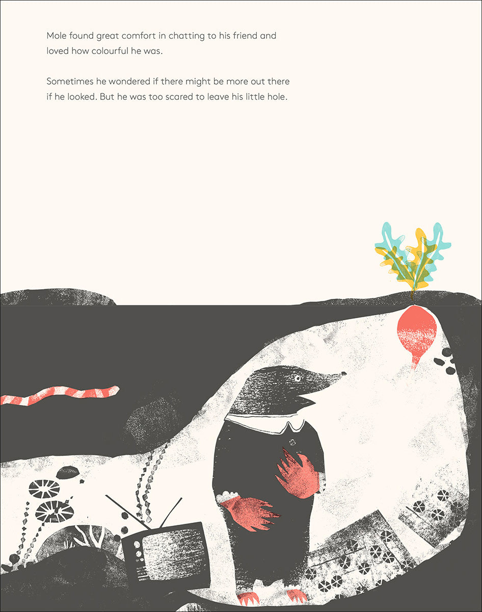 When Mole looks around his underground home, all he sees is the black-and-white world of his cold, dark hole. Mole digs and digs, dreaming of finding something colourful, but day after day, he is disappointed. One day, Mole finds a radish poking through the top of his tunnel like a chandelier. They start chatting, and as Mole listens to the descriptions of life above ground, he imagines bright clothes, red roofs, vibrant green trees, pastel flowers and the blush of the sun as it sinks through the sky. The next morning, Mole is distraught to discover that his chandelier is gone, leaving a hole in its place. He crawls out of the hole and into the world above - and into a place more colourful than he ever dreamed possible.