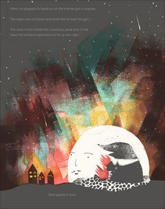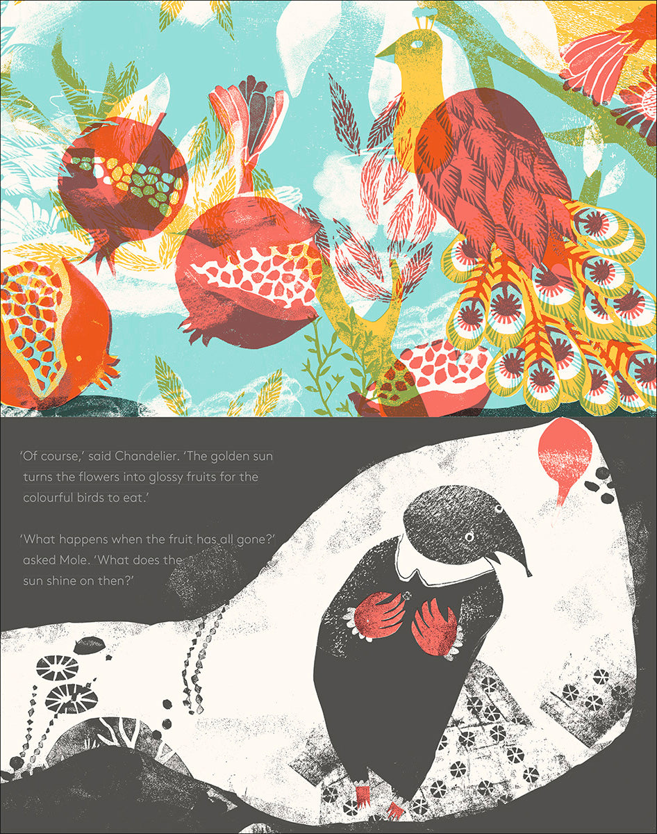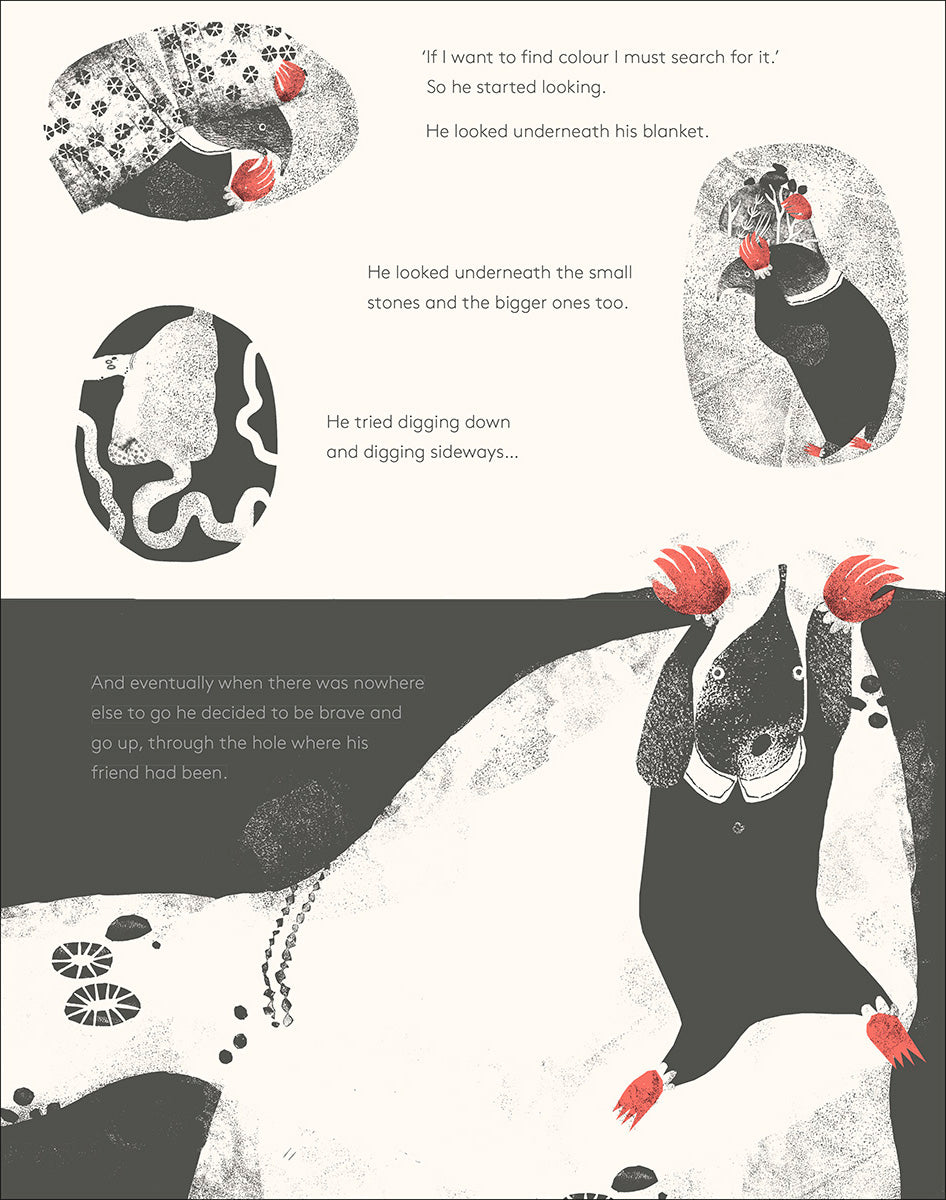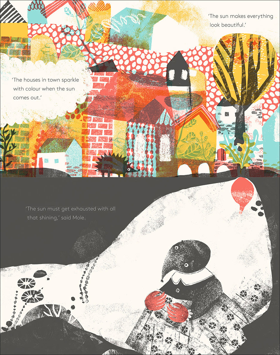 When Mole looks around his underground home, all he sees is the black-and-white world of his cold, dark hole. Mole digs and digs, dreaming of finding something colourful, but day after day, he is disappointed. One day, Mole finds a radish poking through the top of his tunnel like a chandelier. They start chatting, and as Mole listens to the descriptions of life above ground, he imagines bright clothes, red roofs, vibrant green trees, pastel flowers and the blush of the sun as it sinks through the sky. The next morning, Mole is distraught to discover that his chandelier is gone, leaving a hole in its place. He crawls out of the hole and into the world above - and into a place more colourful than he ever dreamed possible.