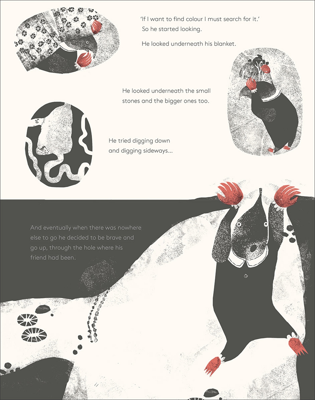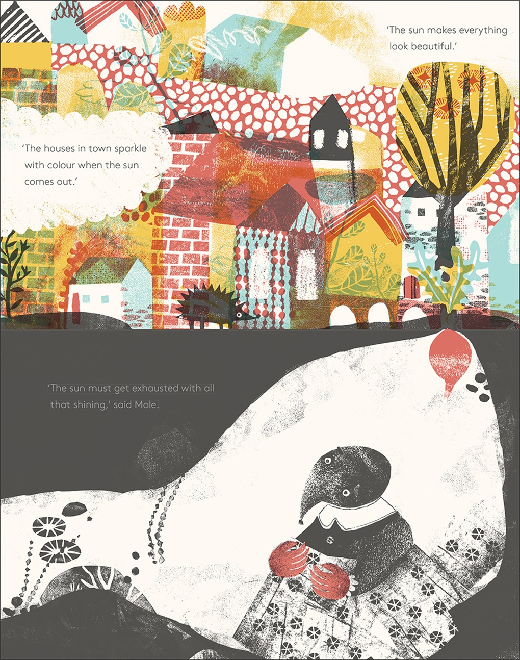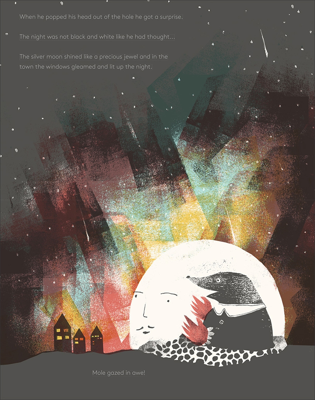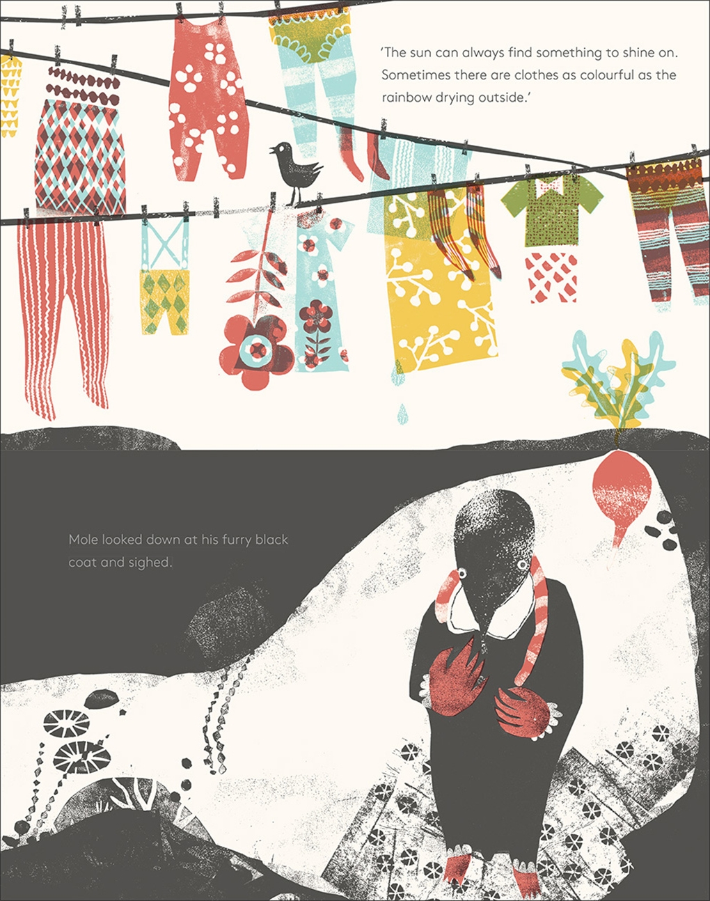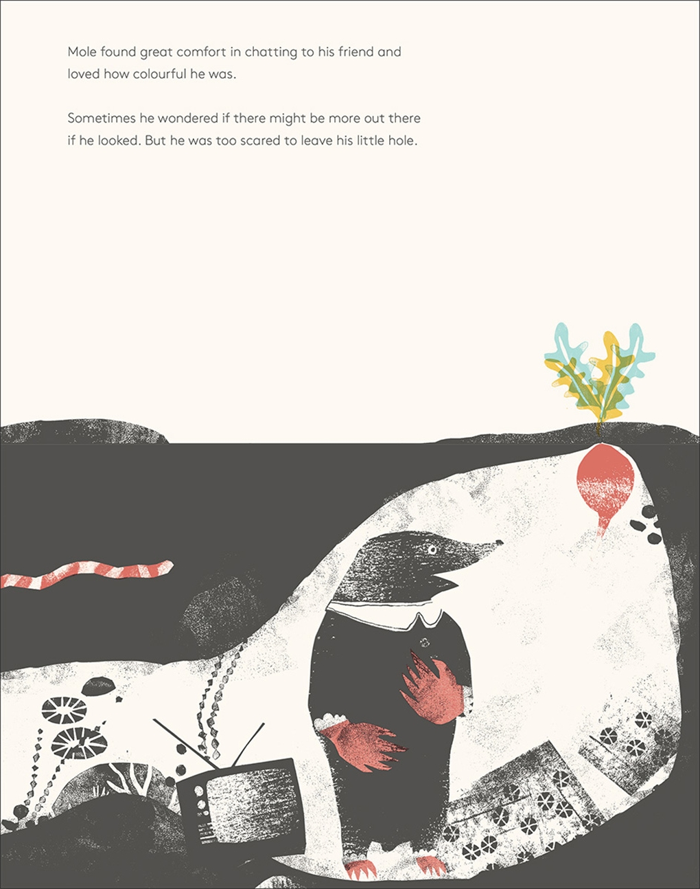 When Mole looks around his underground home, all he sees is the black-and-white world of his cold, dark hole. Mole digs and digs, dreaming of finding something colourful, but day after day, he is disappointed. One day, Mole finds a radish poking through the top of his tunnel like a chandelier. They start chatting, and as Mole listens to the descriptions of life above ground, he imagines bright clothes, red roofs, vibrant green trees, pastel flowers and the blush of the sun as it sinks through the sky. The next morning, Mole is distraught to discover that his chandelier is gone, leaving a hole in its place. He crawls out of the hole and into the world above – and into a place more colourful than he ever dreamed possible.