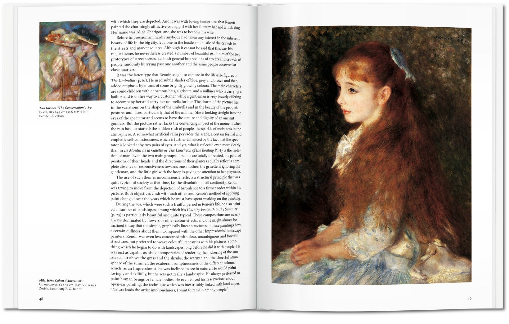 As his career progressed, Renoir investigated different styles and techniques, shifting away from the feathery Impressionist touch to a more robust, classical corporeality, sometimes called his "Ingres period," and later to monumental pieces such as The Bathers. From the abundant output of his lengthy career, this essential artist introduction selects key Renoir works to explore his innovations in the art of painting, as much as his traditions in pursuit of beauty, harmony, and the female form.