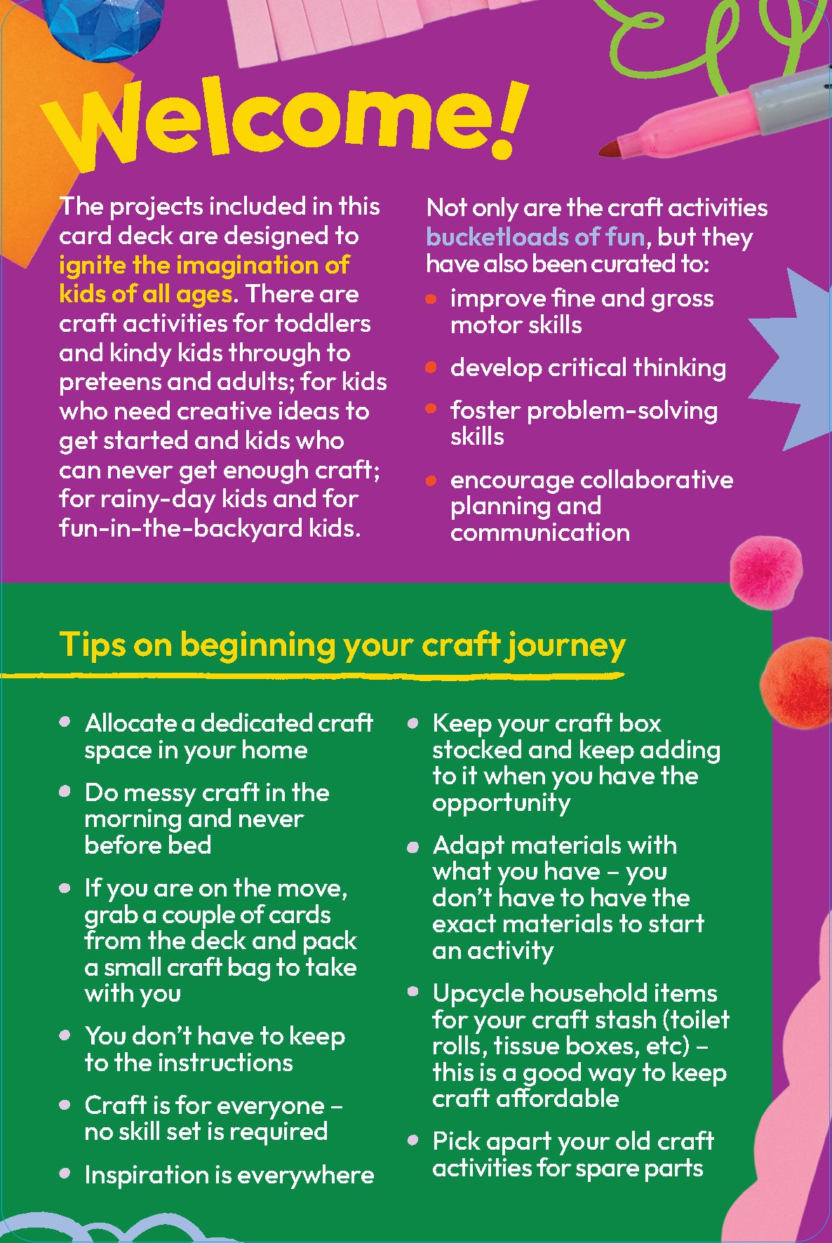 This deck of easy, happy craft projects is packed with fun ideas to enhance creative skills, encourage out-of-the-box thinking, and keep kids entertained.
