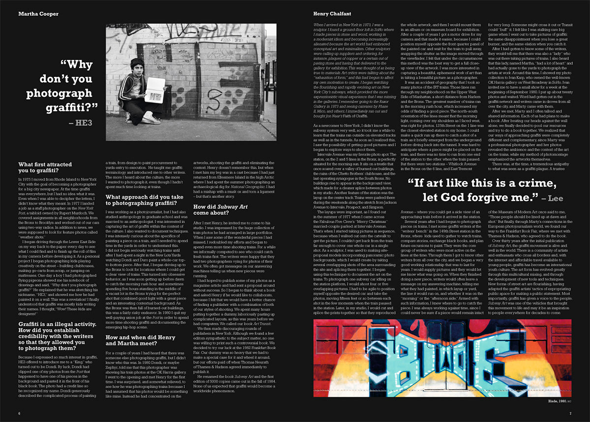• In new introductions Martha Cooper and Henry Chalfant recall how they gained entry to the New York City graffiti community in the 1970s and 1980s.