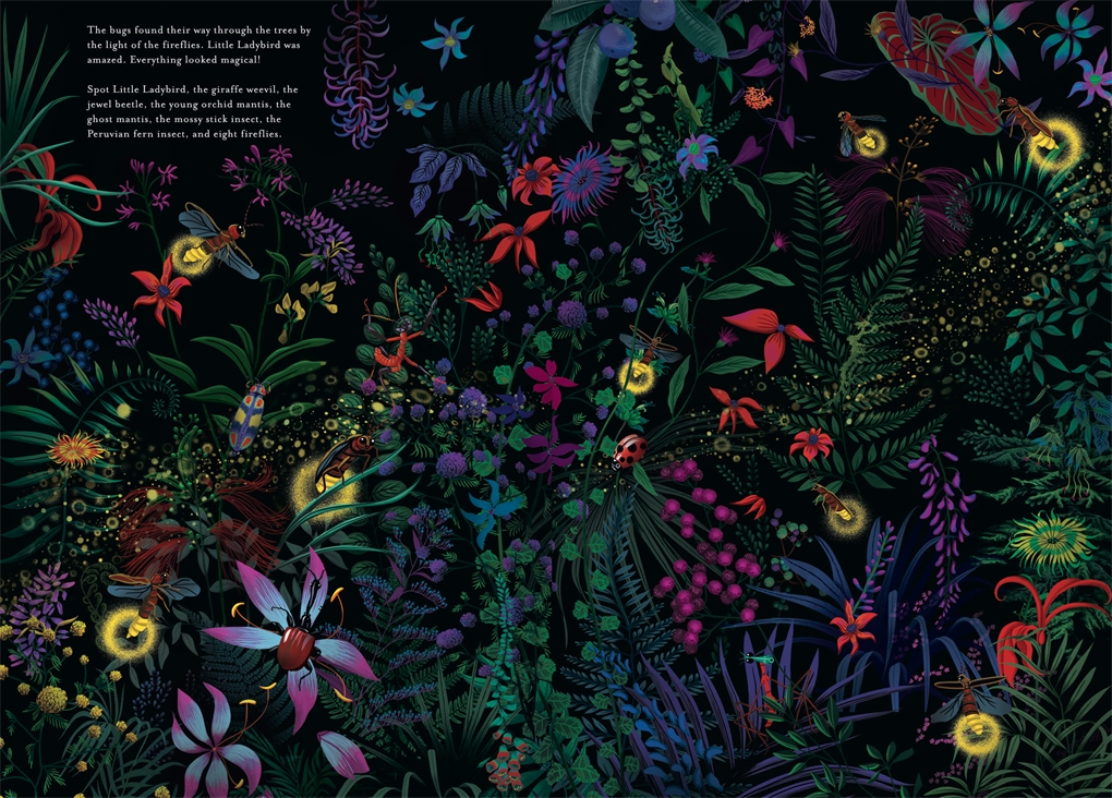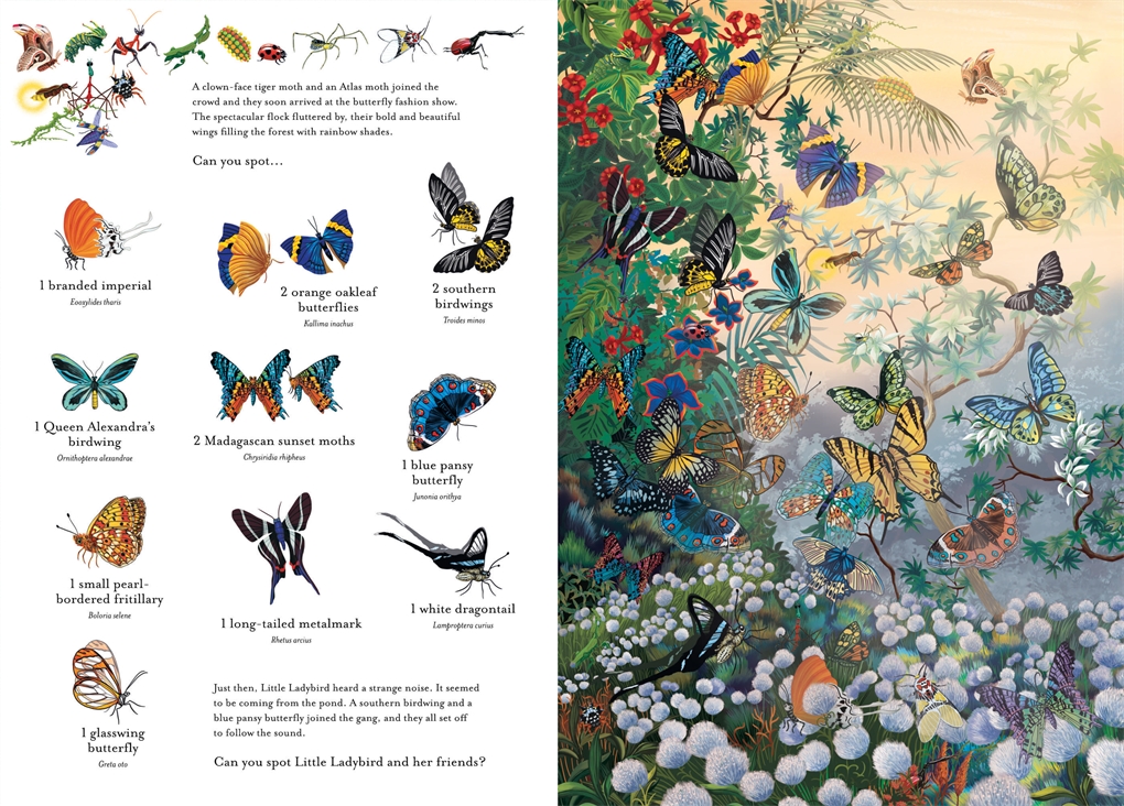 Little Ladybird is bored, so she decides to go and see the world and make new friends. She meets some colourful beetles along the way and is rescued from a big bird by some mantises in a tropical forest. There’s no stopping Little Ladybird and her new friends as they meet spiders, butterflies, frogs and other little creatures, each more beautiful and fascinating than the last. Little Ladybird soon realises that the world is full of wonders: ‘Nature really is an artist!’