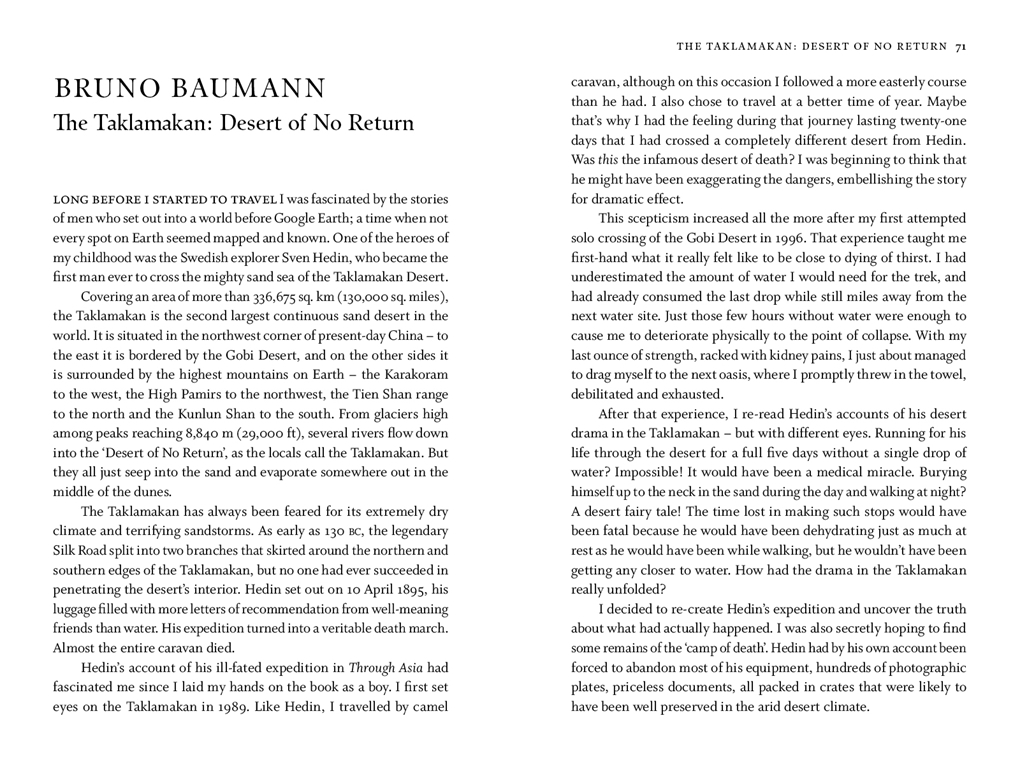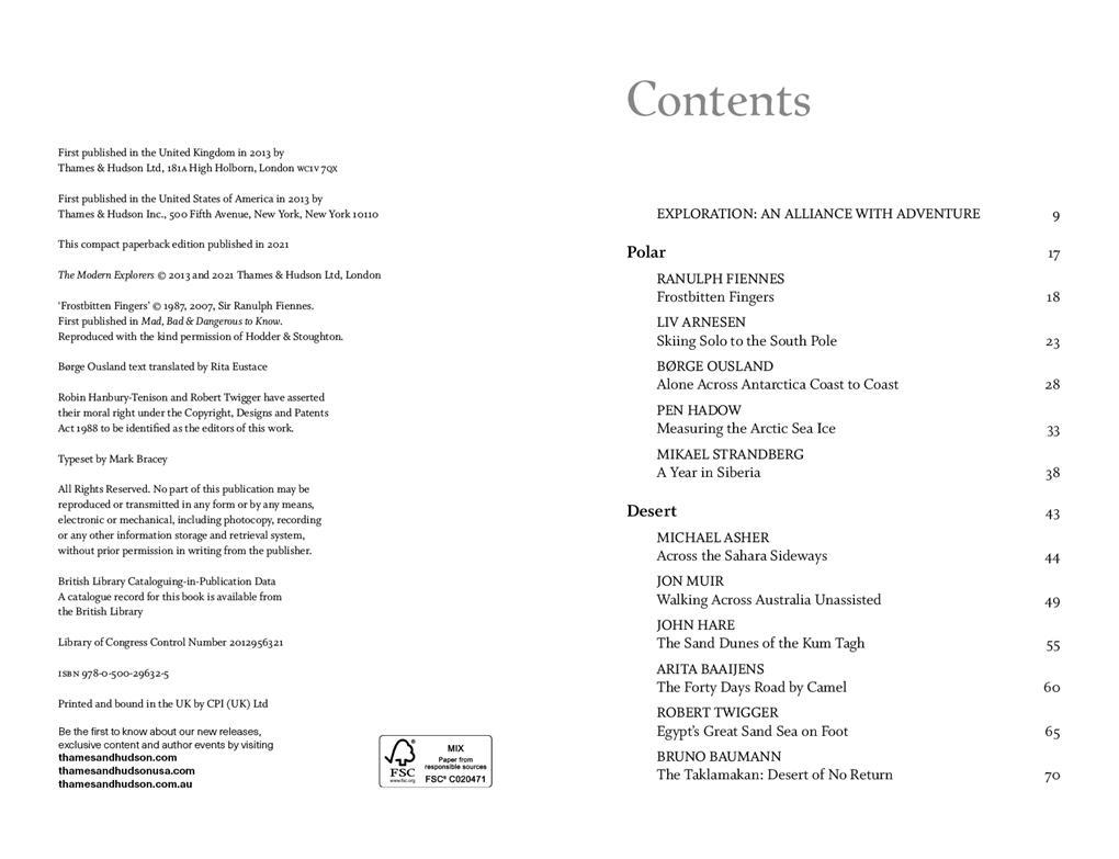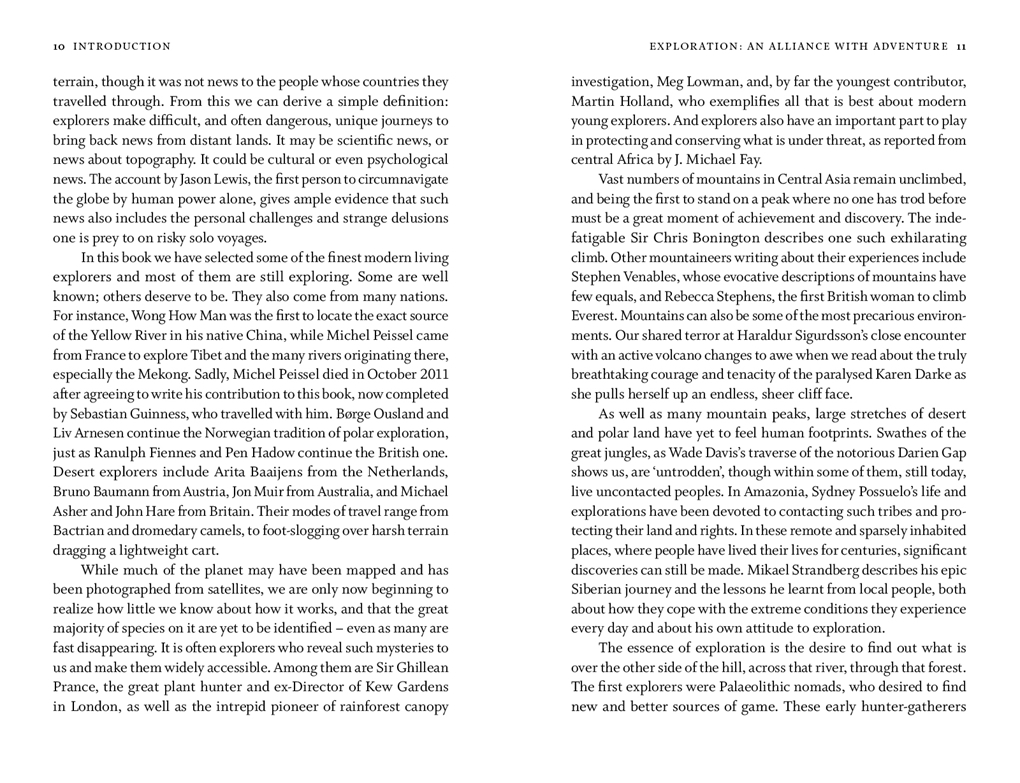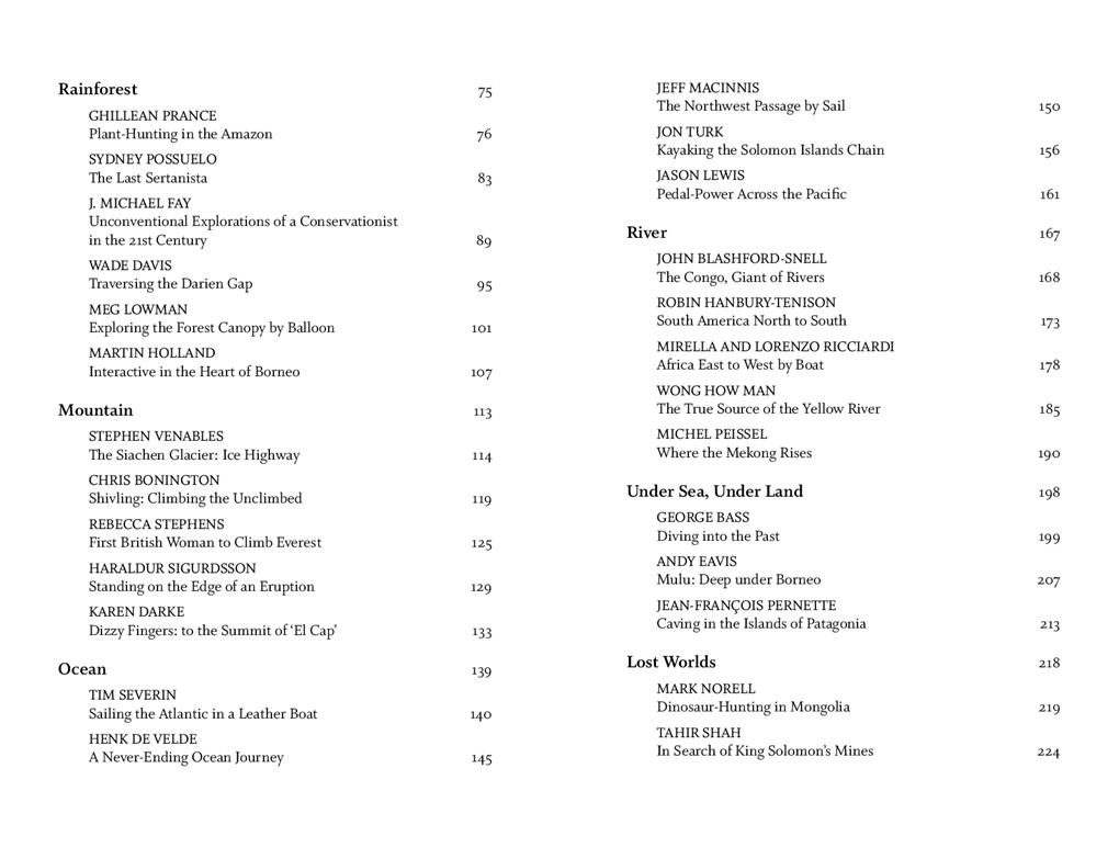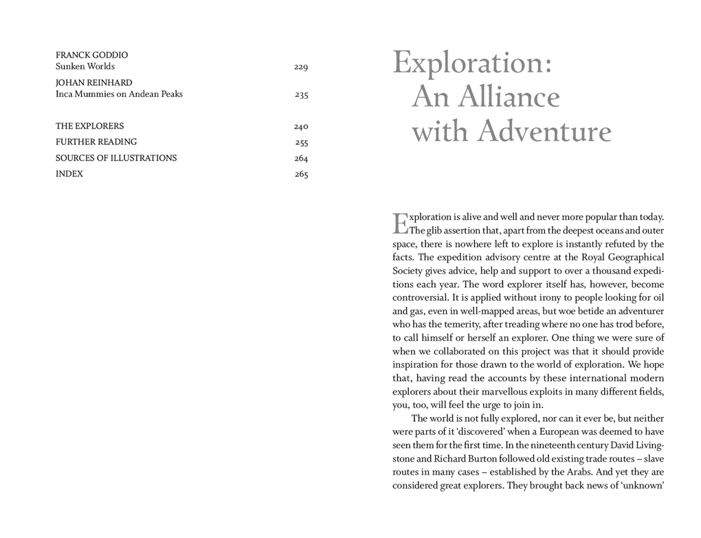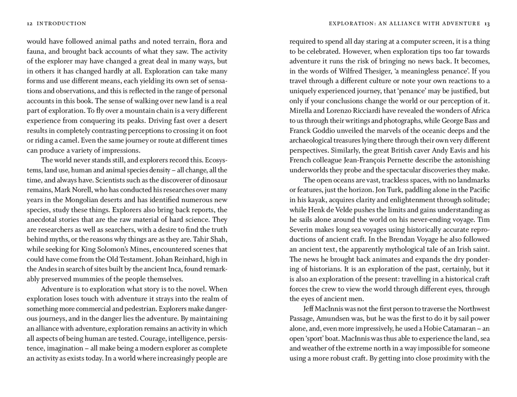Exploration has never been more popular and any idea that there is nowhere left to explore is instantly disproved by the contemporary explorers who are showcased here. Most of the accounts are written by the explorers themselves, and they all vividly describe challenging and extraordinary expeditions to some of the remotest parts of the world, in extremes of temperature and aridity, often alone and on the edge of danger. Some of these explorers are very experienced and are already celebrated worldwide, others are young and less well known and just starting to make their mark; all are driven by ambition, aspiration and passion.