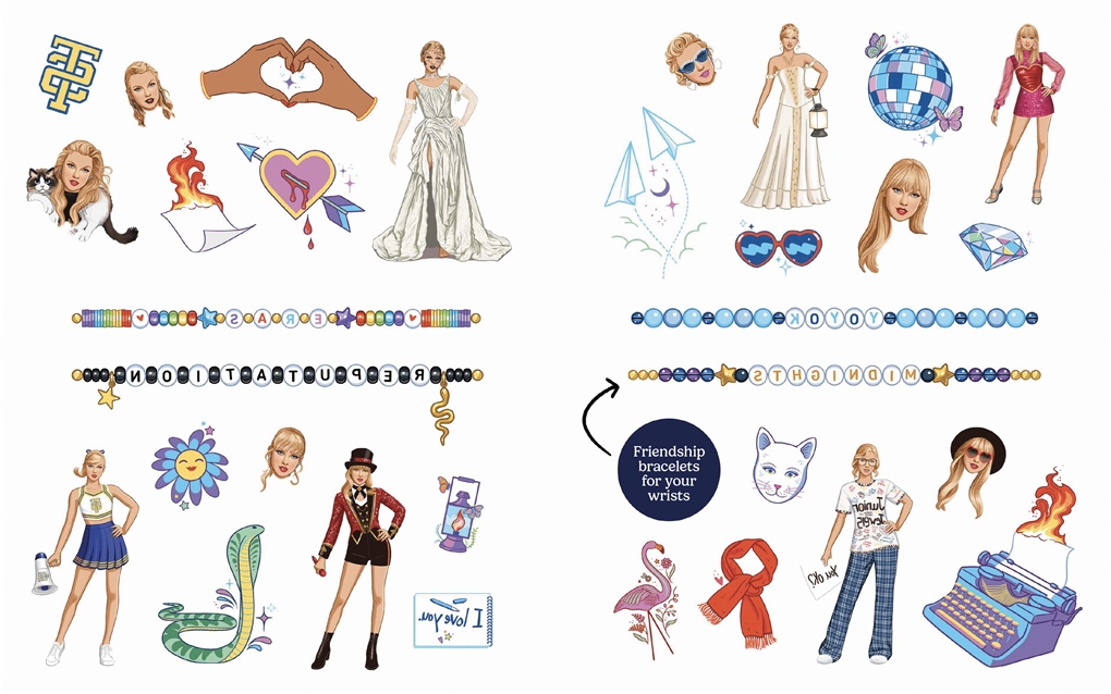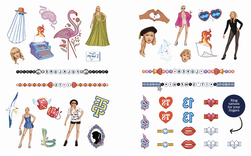 Choose from more than 60 illustrations, including multiple Taylors, friendship bracelets, cats, flowers, butterflies, and typographical tatts, each one equally perfect as a stand-alone tat or as part of a larger mix-and-match artwork.