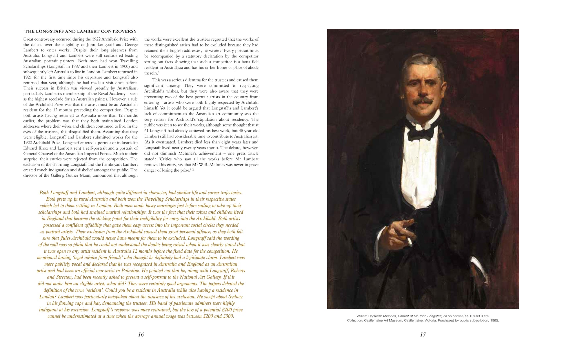 Winner of the Art Gallery of New South Wales' first four Archibald Prizes (1922 to 1925) - and several more thereafter - was Melbourne's William Beckwith McInnes. With the Archibald wins, and then in his early 30s, McInnes was already an acclaimed landscape artist and had exhibited works painted in the British Isles, Spain and Morocco. After his Archibald successes he became, arguably, the country's most sought-after portrait painter with official commissions to paint war heroes, prime ministers, lord mayors and other notables. In 1927 he was commissioned to paint the opening of Canberra's new Parliament House and 1933 saw him in London painting The Duke of York who was soon to take the throne.