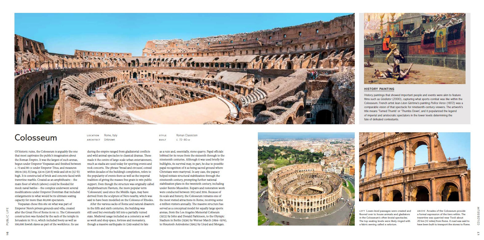 However, a building truly comes alive once it is inhabited, and Architecture Inside + Out also looks beyond the bricks and mortar to explore the principal spaces within. Photographs of striking interiors enable readers to scrutinize the most awe-inspiring aspects of these structures. The reader will discover how ancient wonders, such as the Parthenon and Colosseum, were constructed; learn the colour-coding behind the exposed skeleton of the Centre Pompidou in Paris; understand the vision behind the Brutalist housing complex, Habitat 67, in Canada; and take a tour through the Capitol Building in Washington, the seat of the United States Congress.
