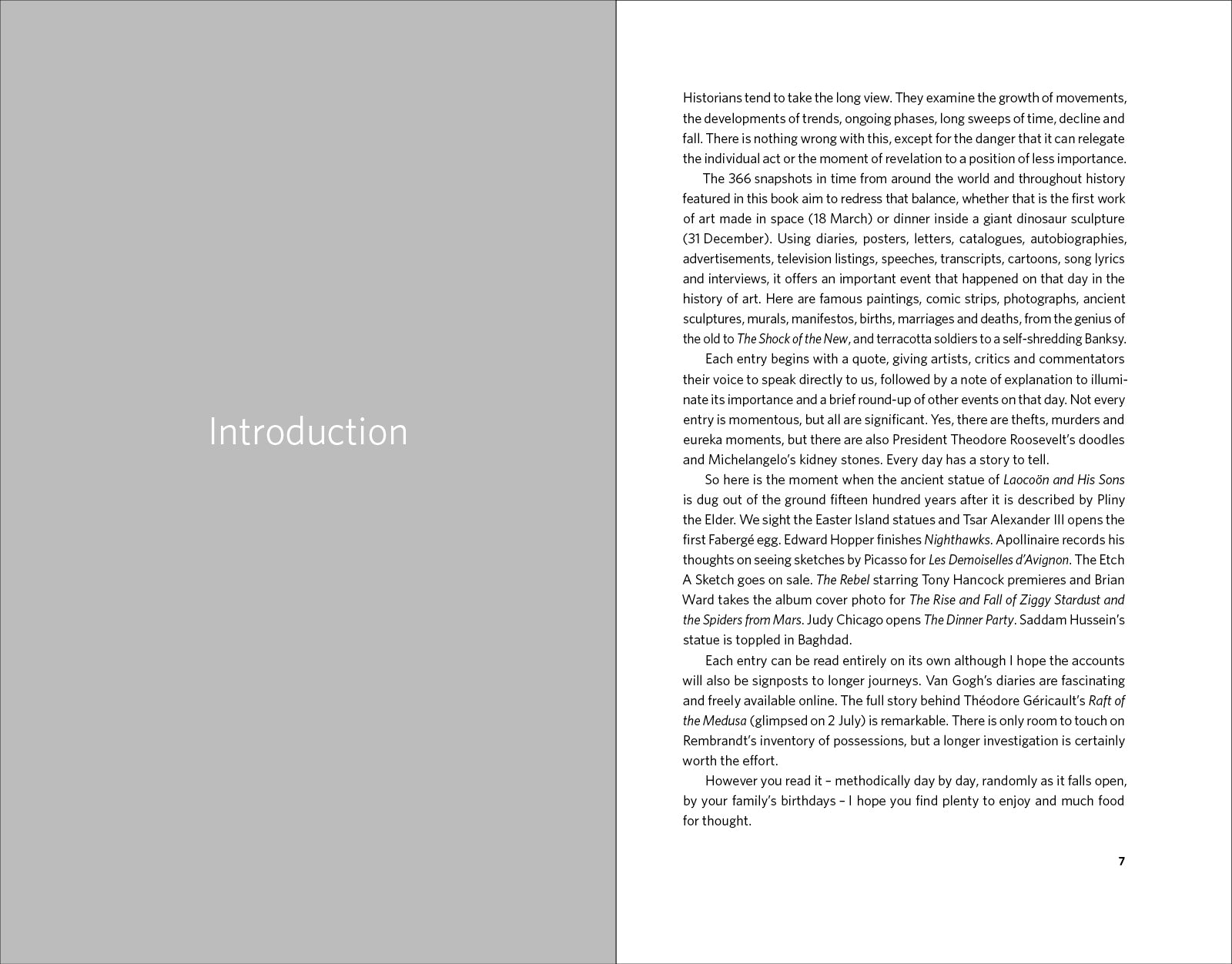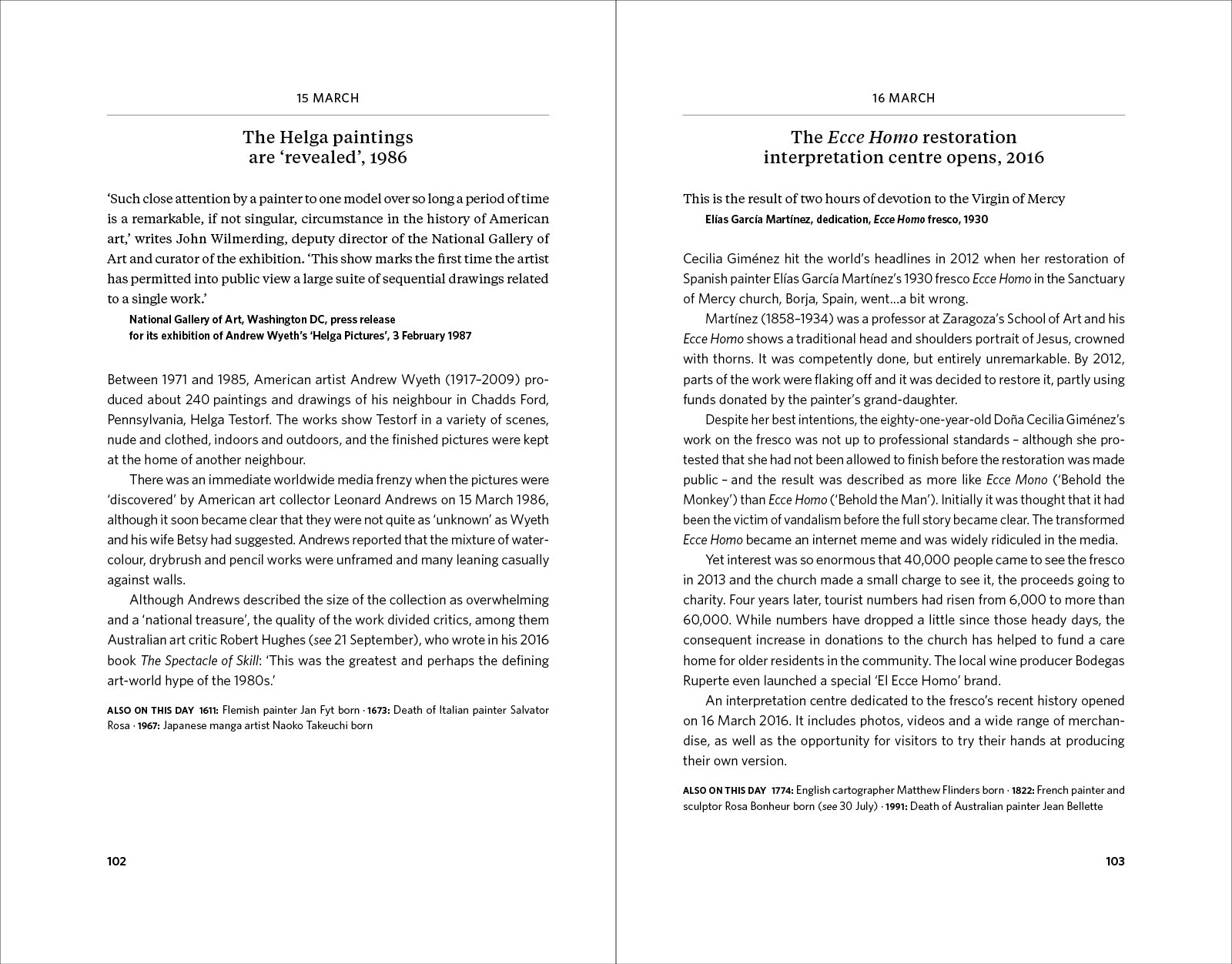 Each day has its own section, starting with an extended quote giving artists, critics and commentators their voice to speak directly to us, followed by a brief explanatory text, and ending with other important events in art on that day e.g. births, deaths and exhibition openings. Not every entry is momentous, but all are significant. Yes, there are thefts, murders, artistic mishaps and eureka moments, but there are also more relatable episodes such as President Theodore Roosevelt's doodles, Michelangelo writing to his nephew about his kidney stones and Monet getting the green light for his water garden. Every day has a story to tell.
