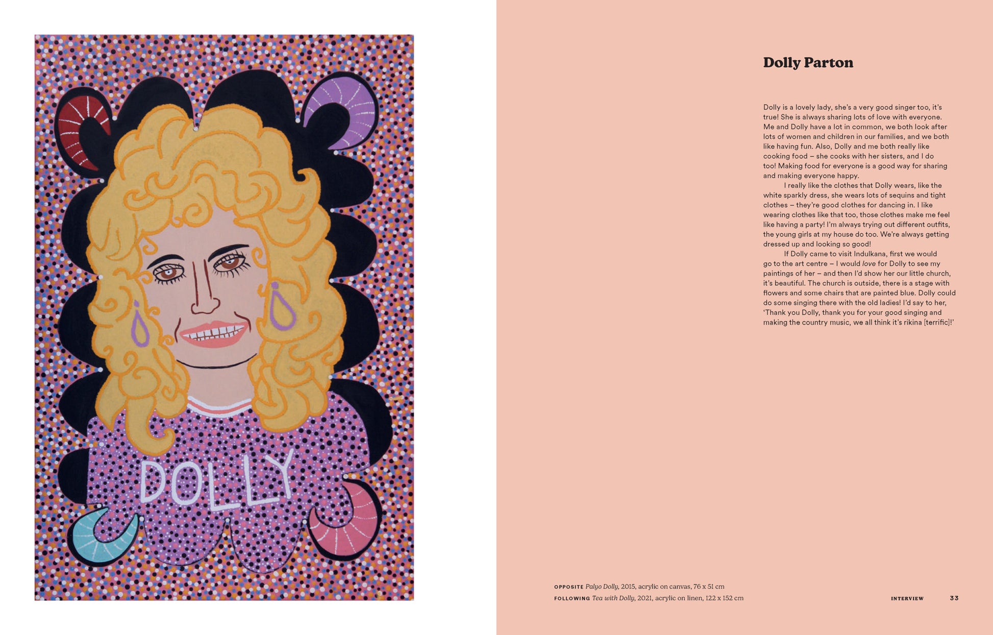 'It's one of my dreams for Dolly to come and visit me in Indulkana. I love to listen to her music while I paint: "9 to 5", "Coat of many colours", "Jolene", and my number one, "Islands in the stream" with Kenny Rogers. I often think if Dolly came to visit, what would she do? What would she say? And what would she be wearing?' - Kaylene Whiskey.