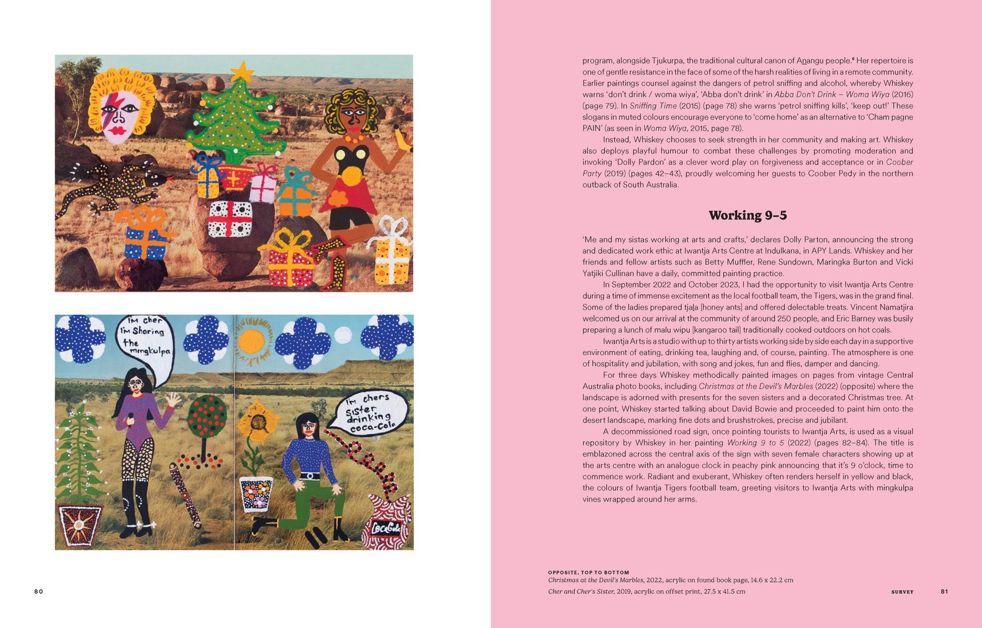 Her comic-book style and text bubbles are hilarious yet potent symbols of female power in an Aboriginal setting. A joyful visual anthem, Whiskey's work draws from the country music, rock'n'roll and Anangu songs played in her household growing up. An in-depth interview with the artist punctuates the richly illustrated pages in which Whiskey describes her creative process - blending Anangu traditions with contemporary culture by painting jugs of Coca-Cola alongside mingkulpa (native bush tobacco), lollipops, honey ants and love hearts.