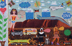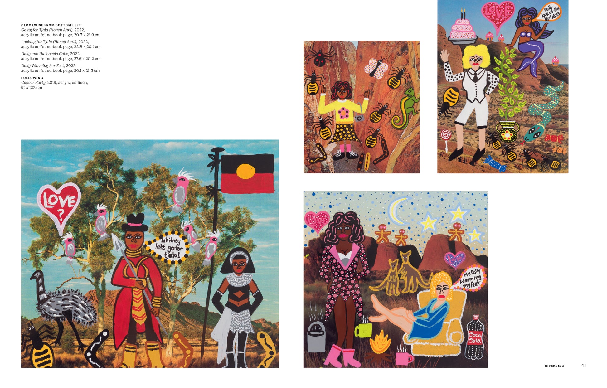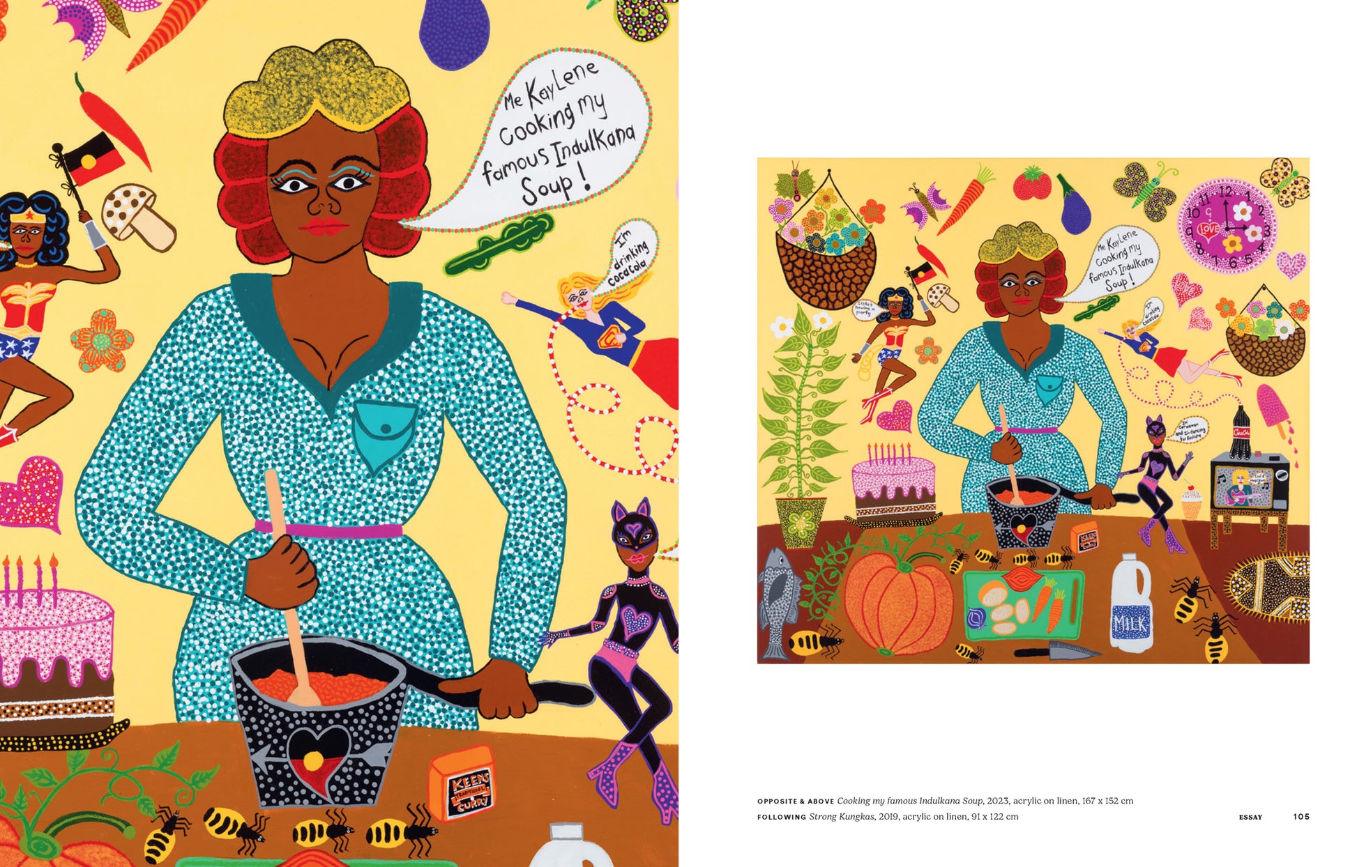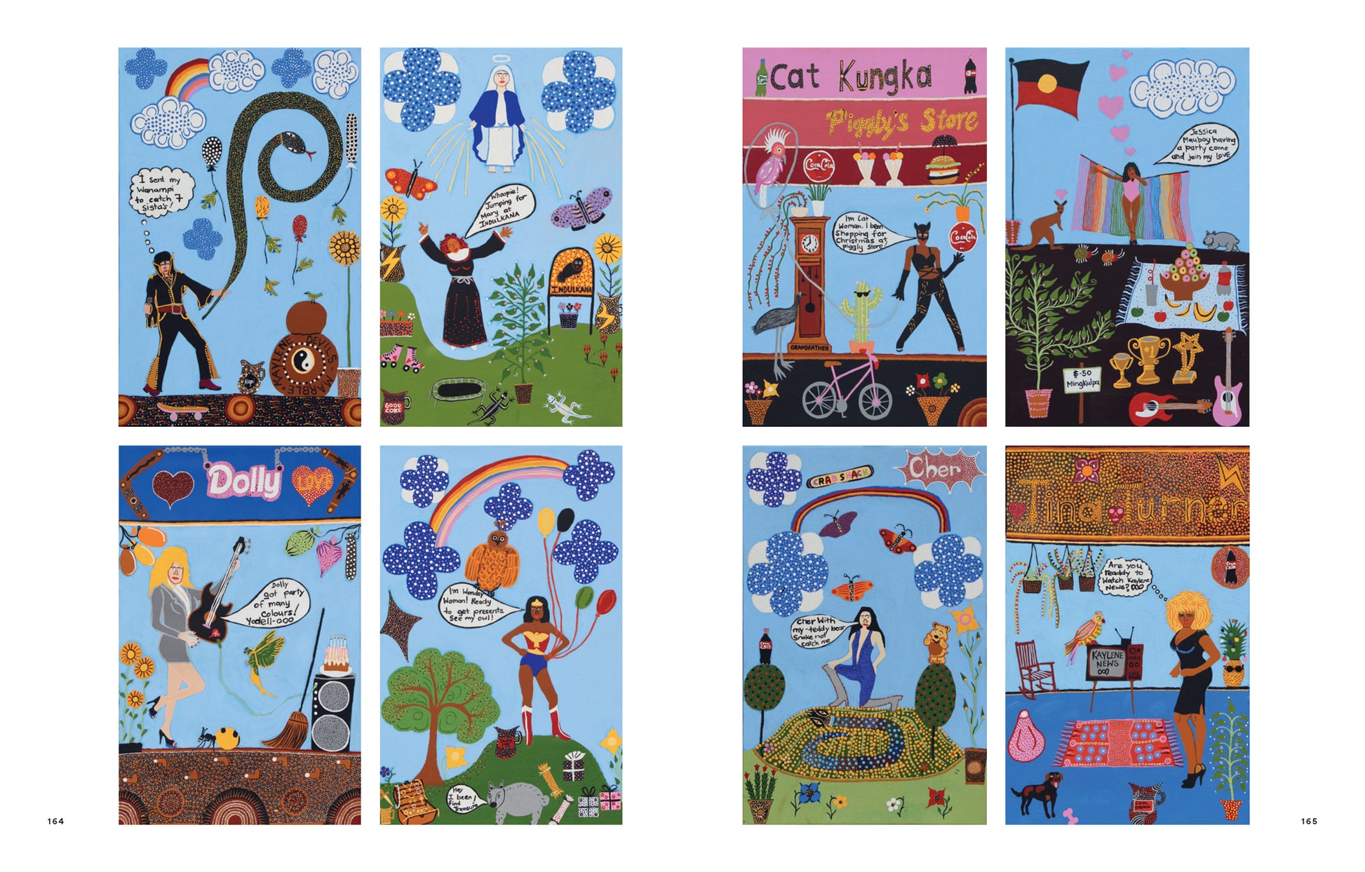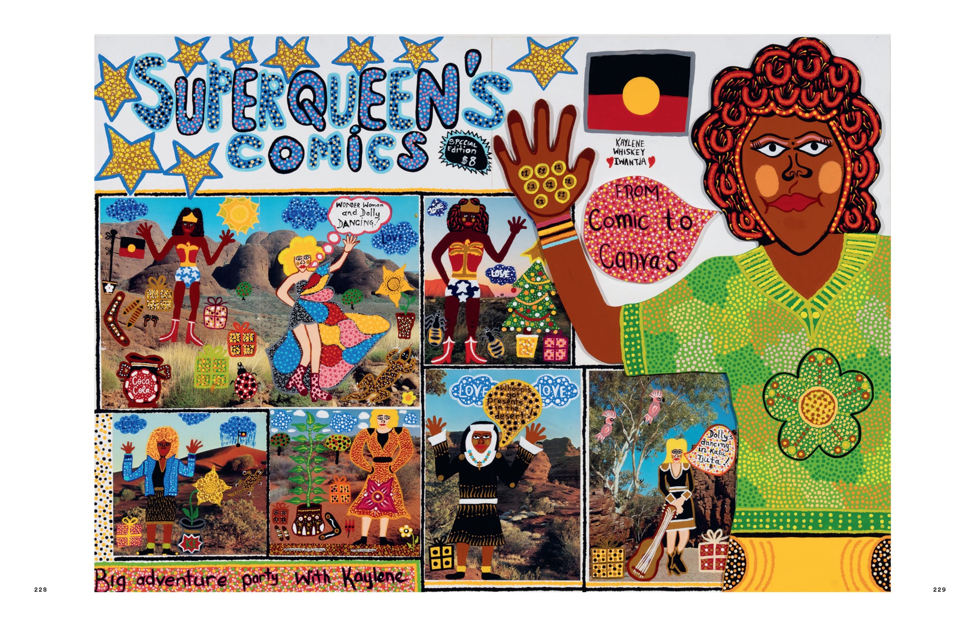 Her comic-book style and text bubbles are hilarious yet potent symbols of female power in an Aboriginal setting. A joyful visual anthem, Whiskey's work draws from the country music, rock'n'roll and Anangu songs played in her household growing up. An in-depth interview with the artist punctuates the richly illustrated pages in which Whiskey describes her creative process - blending Anangu traditions with contemporary culture by painting jugs of Coca-Cola alongside mingkulpa (native bush tobacco), lollipops, honey ants and love hearts.