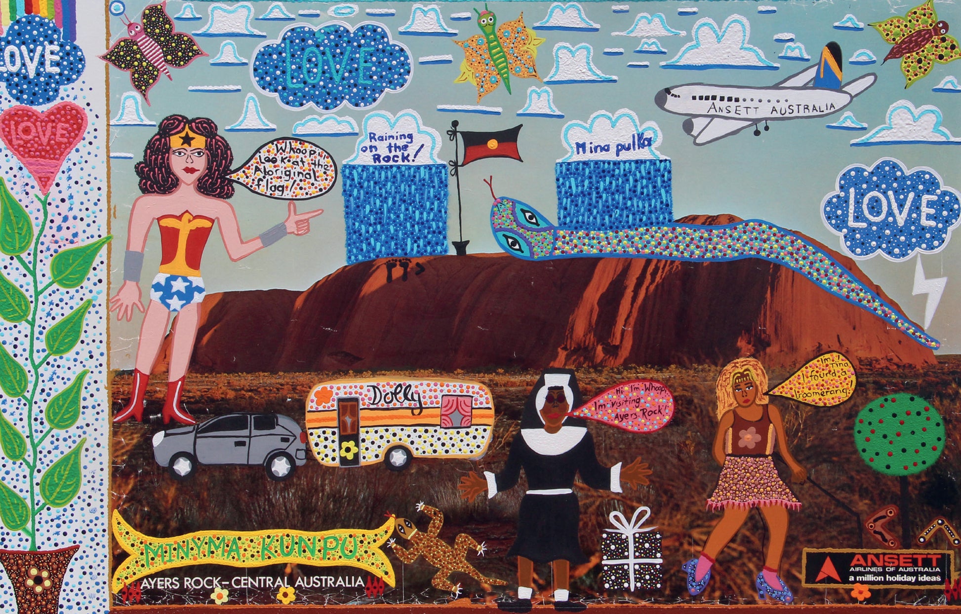 Kaylene Whiskey's paintings dazzle with brightly coloured pop stars rendered in dots and set amongst her own community in remote Central Australia. She depicts female pop culture icons - including Dolly Parton, Tina Turner, Catwoman, Cher and Wonder Woman - all connected to the Kungkarangkalpa Tjukurpa, or Seven Sisters Story. These heroines, however, are shown partying at Iwantja Art Centre in Indulkana, South Australia.