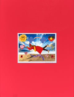 'This is me, Super Kaylene, flying through the sky! I'm flying over Indulkana, my home. The sun is shining and bringing out the colours of our beautiful desert Country. Whenever I go travelling I always come back home to Country, friends and family - I'm just like the boomerang!