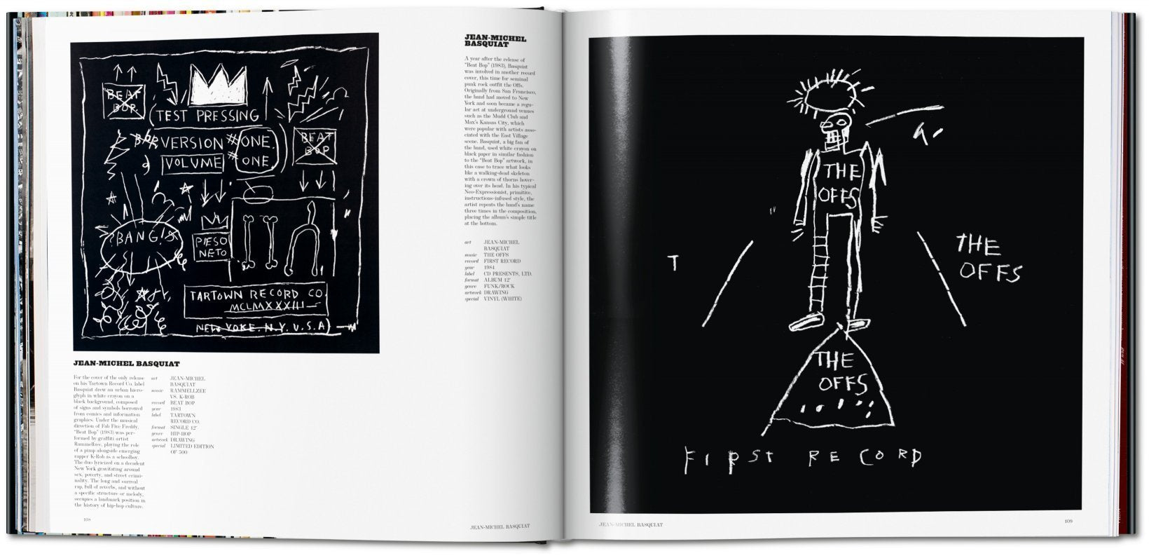 Along the way, we find Jean-Michel Basquiat's urban hieroglyphs for his own Tartown record label, Banksy's stenciled graffiti for Blur, Damien Hirst's symbolic skull for the Hours, and a skewered Salvador Dalí butterfly on Jackie Gleason's Lonesome Echo. There are insightful analyses and fact sheets alongside the covers listing the artist, performer, album name, label, year of release, and information on the original artwork. Interviews with Tauba Auerbach, Shepard Fairey, Kim Gordon, Christian Marclay, Albert Oehlen, and Raymond Pettibon add personal accounts on the collaborative relationship between artists and musicians.