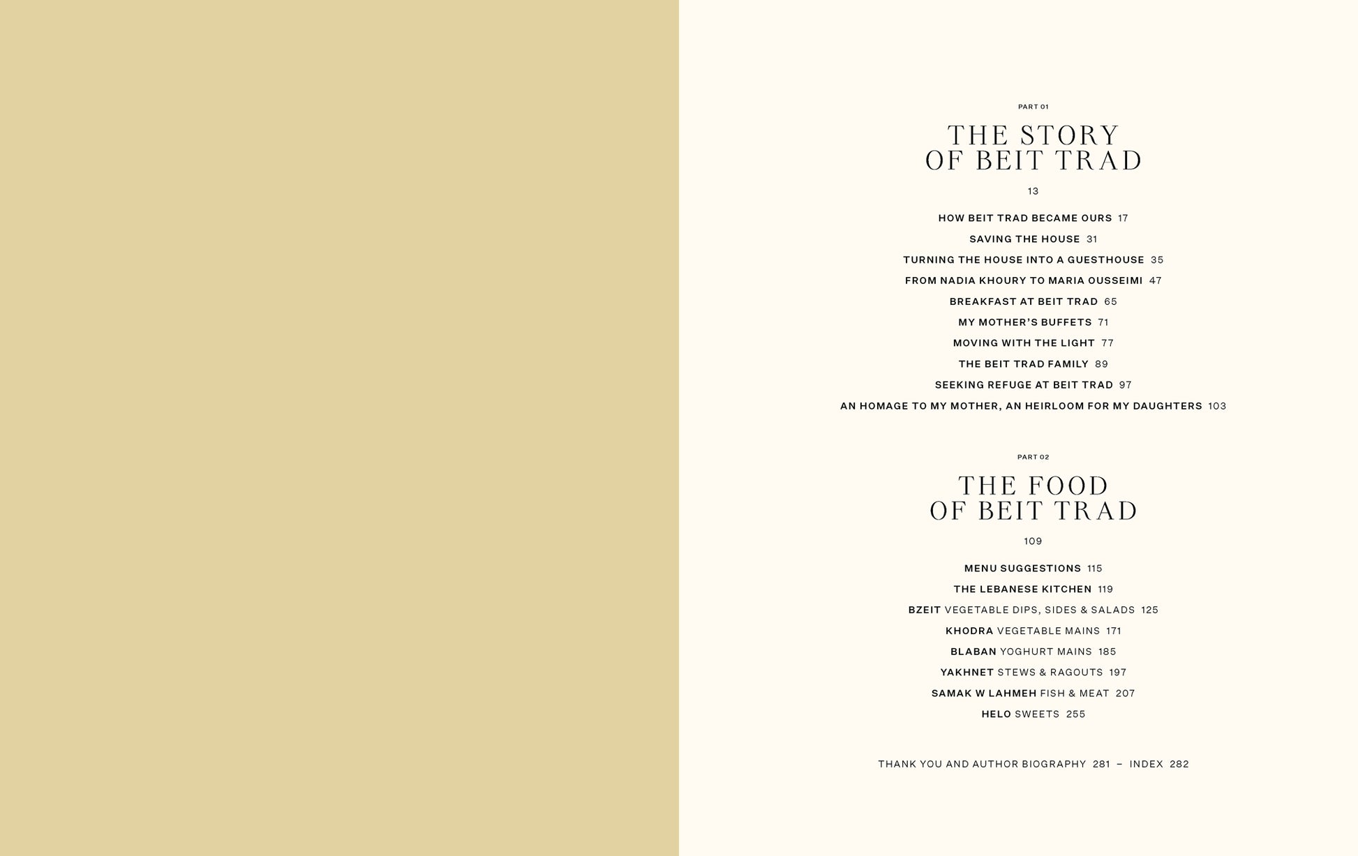 Through personal memories, the careful restoration of the estate and a collection of beloved recipes, Beit Trad: Recipes, Stories & the Art of Lebanese Hospitality invites readers to experience a way of living where generosity, abundance and care shape every moment of a house bathed in light. Beit Trad is a refuge, a celebration of Lebanese home traditions and a living link between generations. It is a place where friends become family, where every visit is a ritual, and where the art of hosting is preserved, shared and passed on to future generations.