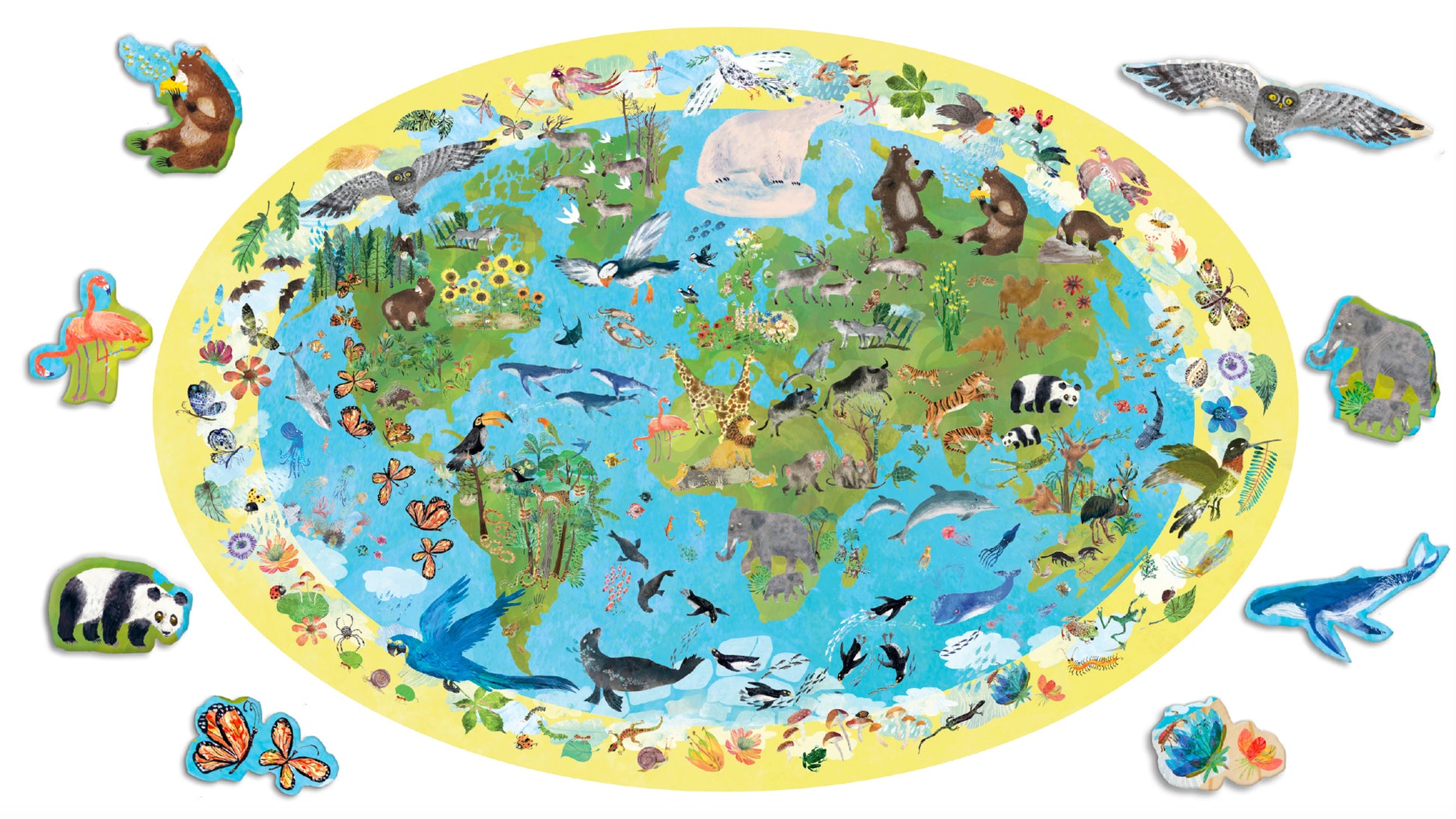 Discover the diversity of beasts, ocean-dwellers, bugs and blooms on our planet through Yuval Zommer's Earth-shaped puzzle.