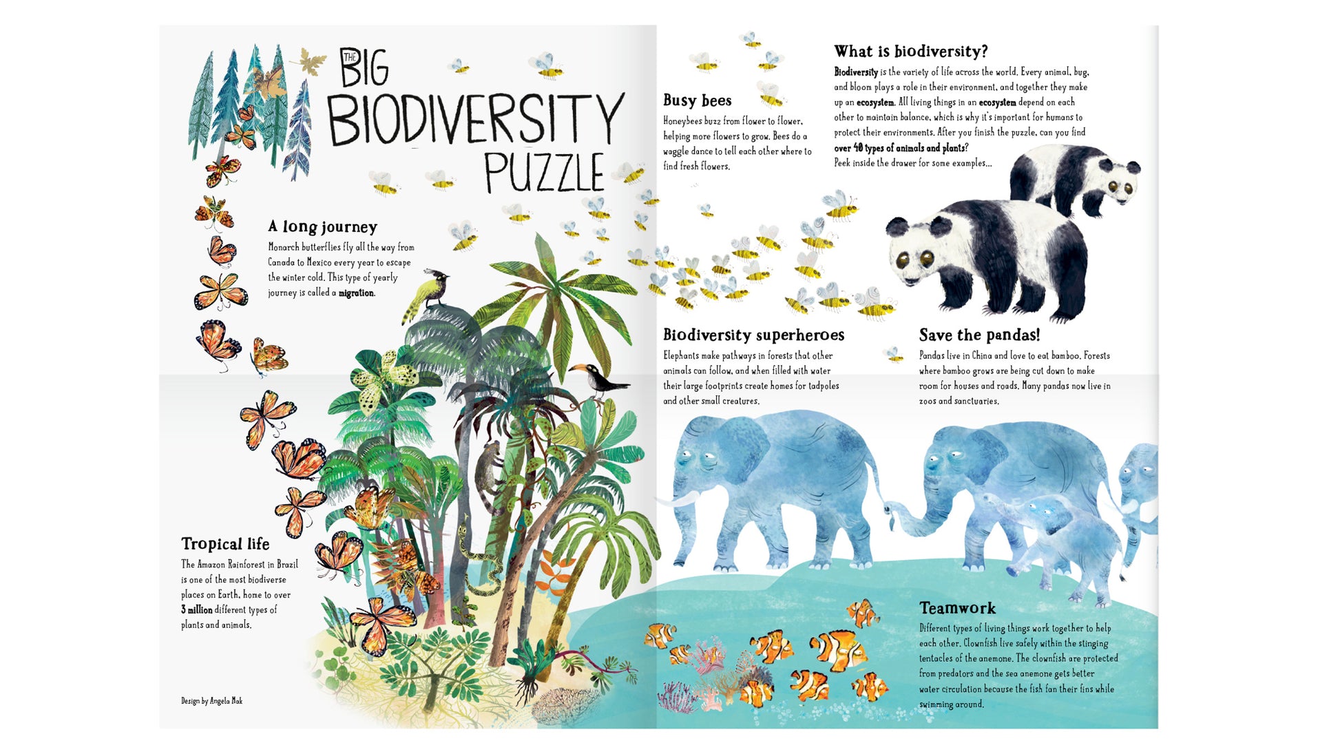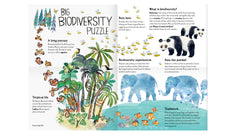The Big Biodiversity Puzzle is an introduction to biodiversity with over forty creatures, illustrated by Yuval Zommer. Did you know that the Amazon Rainforest is home to over 3 million types of plants and animals? And that bees dance to tell each other where to find fresh flowers? Or that elephant footprints create homes for tadpoles? Learn about animals and geography as you piece the Earth together.