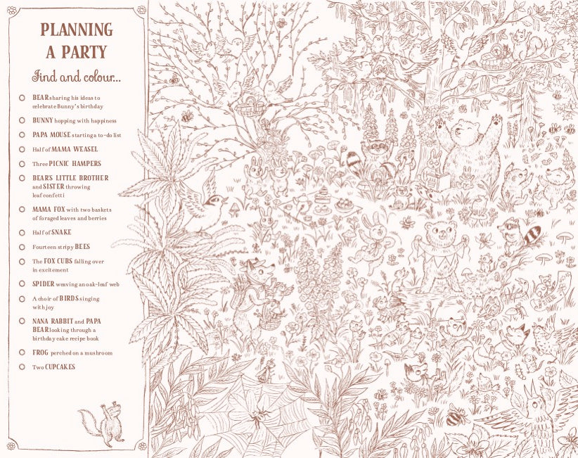 Join the fun in Brown Bear Wood with this enchanting colouring and spotting book. Each double page spread includes a list of things to find and colour, then prompts you to colour in the rest of the scene to bring the woodland world to life.