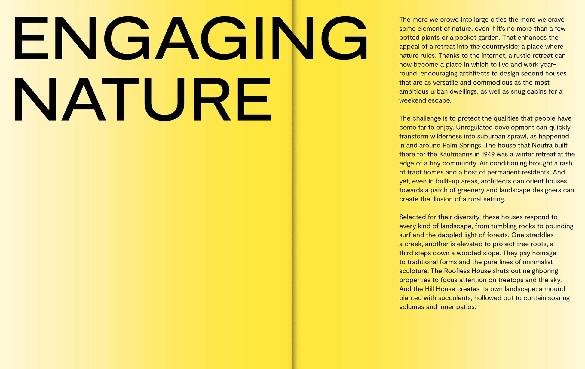 The selection ranges from a landscaped concrete dome to an inflatable shelter that can be assembled and relocated as easily as a tent. An expansive ocean-front retreat contrasts with a bungalow that has been transformed on a shoestring budget and a weekend cabin in a desert wilderness. One house cascades down a wooded hillside, another spans a creek, and several more are tucked into confined city lots.