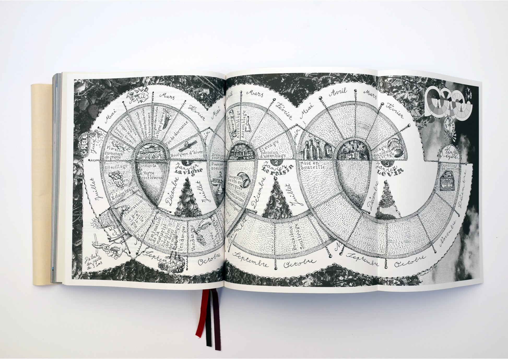 A chronology introducing the past 150 vintages includes informative tasting notes, meteorological aspects, and the grape blends that mark each vintage. An archival gem has been unearthed for each year: from the harvesters' menu in 1922 to portraits by master photographers like Robert Doisneau, Richard Avedon, and Paolo Roversi. A fold-out original illustration by M/M Paris tracing the winemaker's month-by-month activity from vine to of wine."