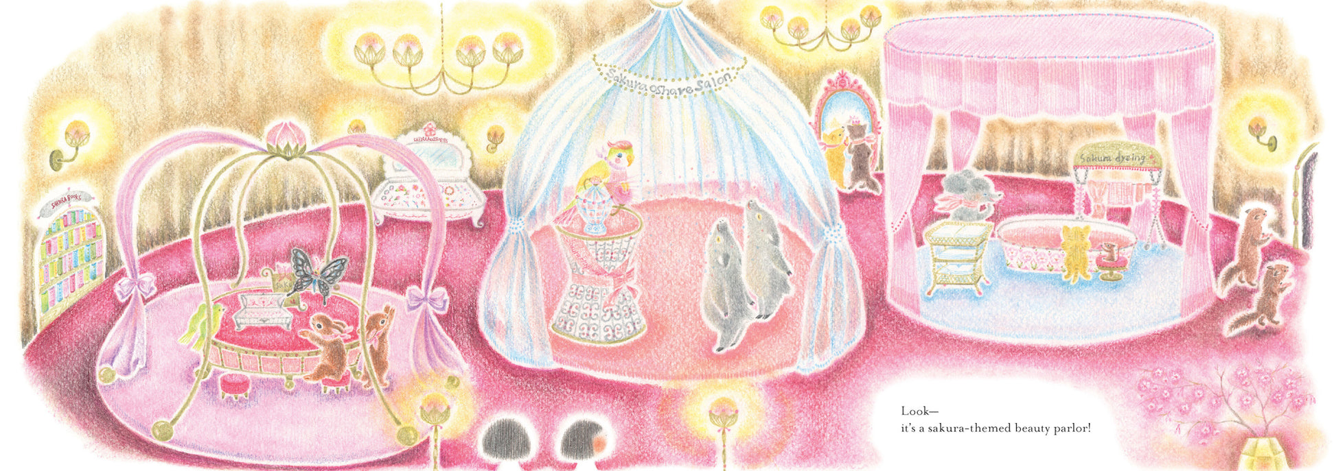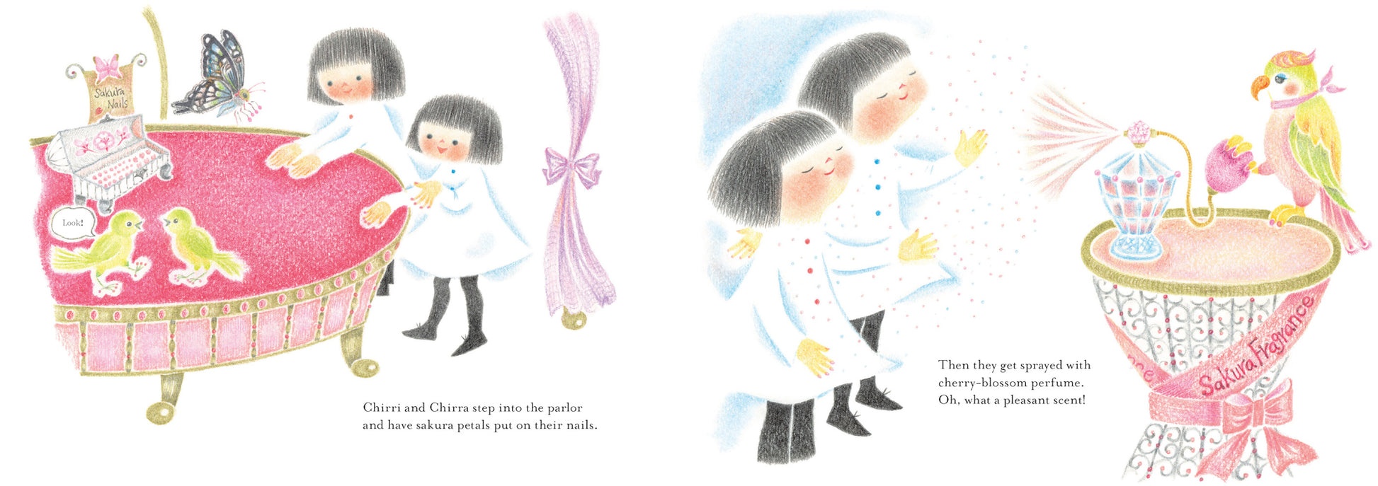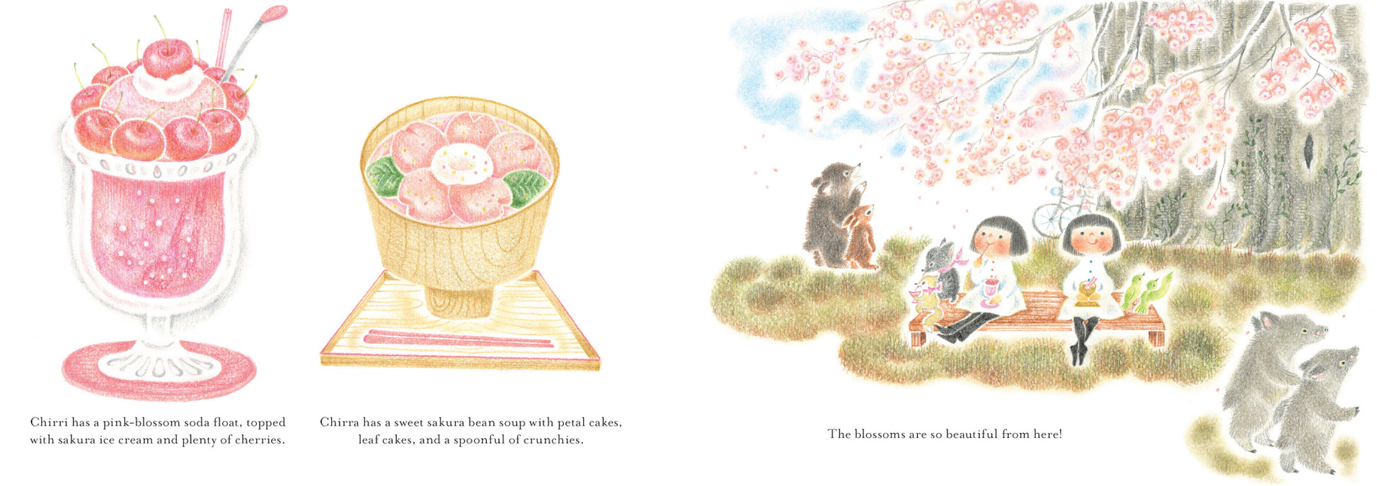 Chirri & Chirra, Among the Cherry Blossoms, the ninth book in our beloved Chirri & Chirra series, takes readers on yet another charming adventure filled with delicious food, animal friends, and the beauty of nature. Here, Chirri and Chirra ride their trusty bicycles to a giant cherry tree. After tasting delicious cherry-blossom sweets, they go inside the tree, where they find a sakura-themed beauty parlor! Decked out in chiffon scarves and spritzed with sweet perfume, their next stop is the viewing deck, where they sip cherry-blossom tea and enjoy the most amazing experience of all: the moment when the petals, shaken loose by a gust of wind, float down to the ground in a gorgeous shower. A translator’s note about sakura trees is included.