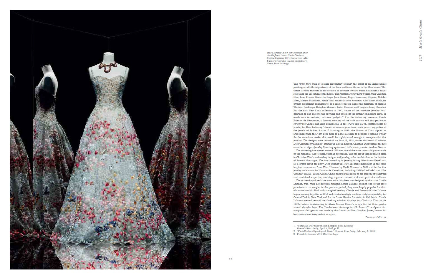 Recurring themes from the history of Dior are discussed in depth: the concept of line and architecture in fashion; the influence of history and art (the Palace of Versailles, the Empire style, Impressionism, the Belle Époque, the Ballets Russes, Picasso, Dalí, Pollock); the use of colour; the influence of gardens and landscapes as sources of inspiration; and, of course, the brand's muses and famous clients: the Duchess of Windsor, Marlene Dietrich, Princess Grace of Monaco, Marilyn Monroe, Elizabeth Taylor, Isabelle Adjani, Princess Diana, Marion Cotillard, Charlize Theron, Natalie Portman, Jennifer Lawrence and more.