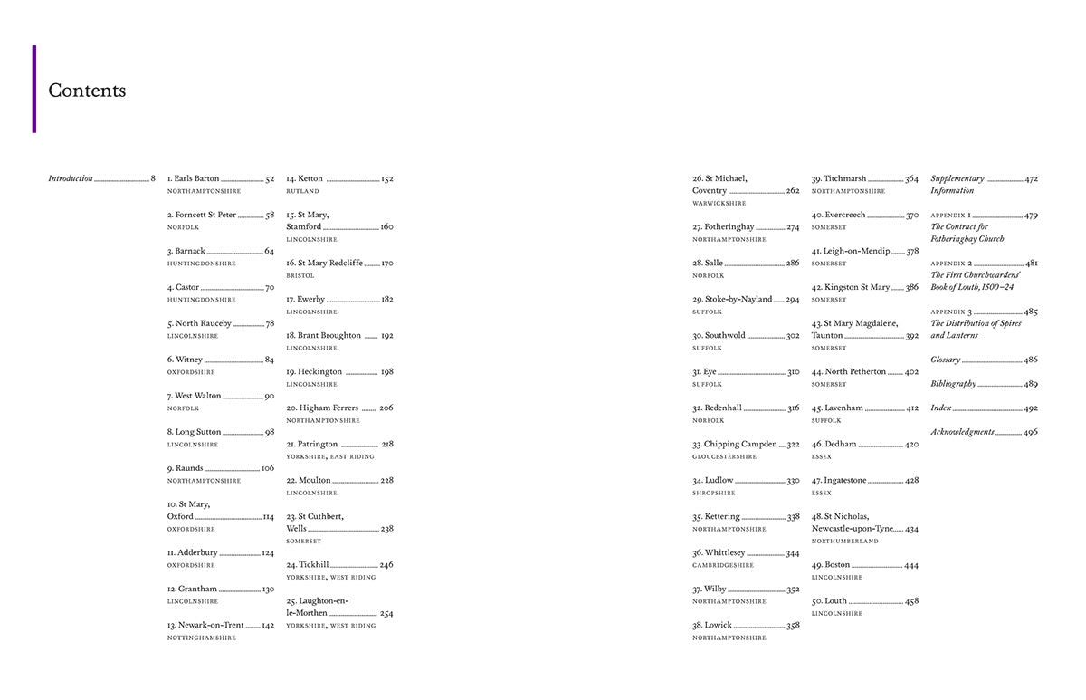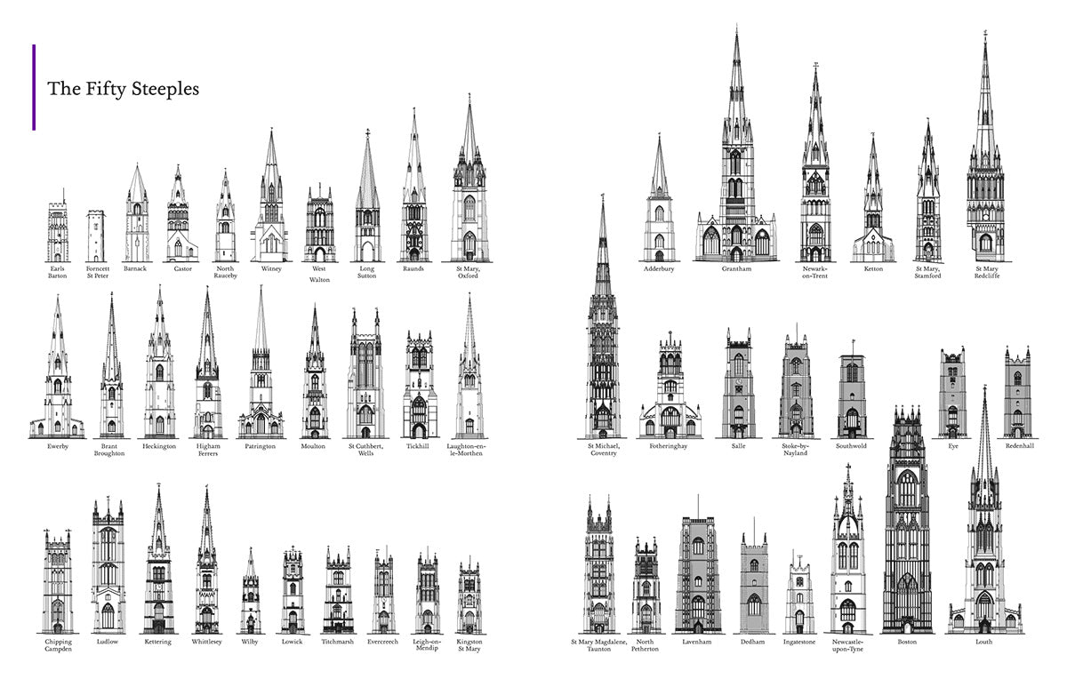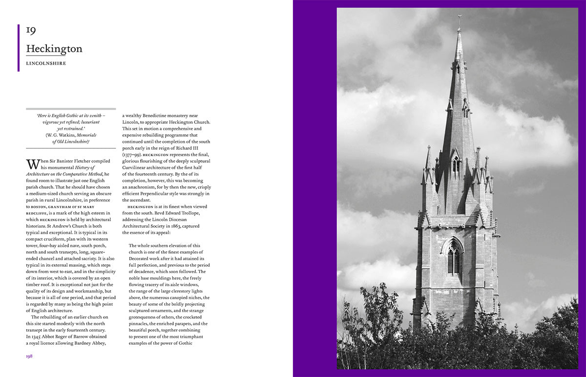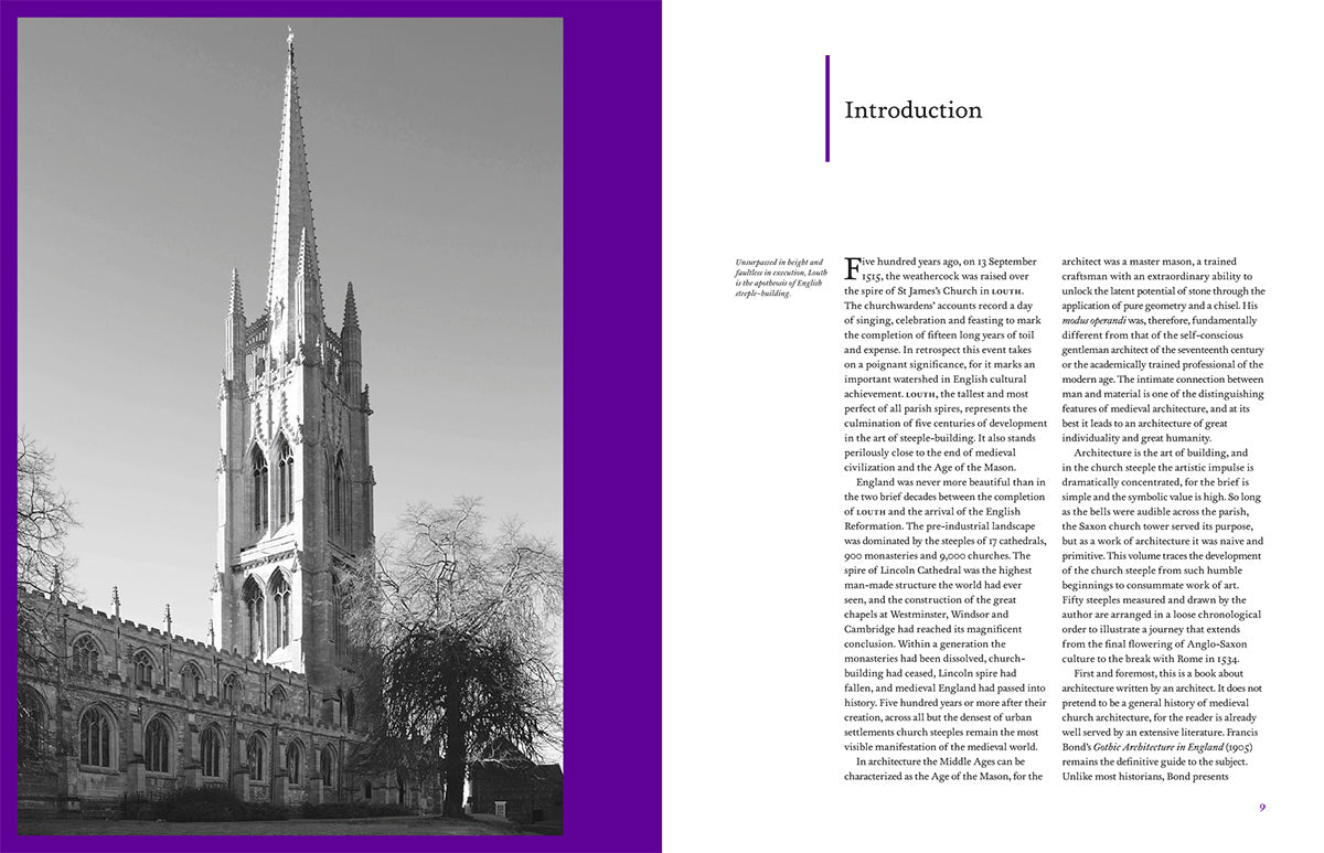 The main part of the book is devoted to a richly illustrated survey of the fifty most important medieval steeples in England, from renowned Saxon churches such as Earls Barton, Northamptonshire, to those of almost cathedral-like proportions such as Salle in Norfolk or Chipping Campden in the heart of the Cotswolds.