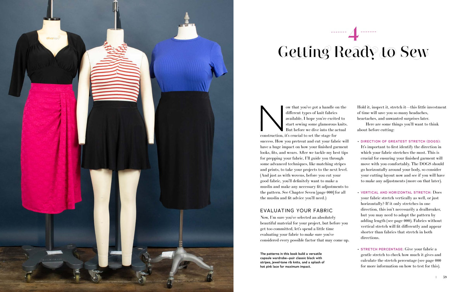 The book is divided into two helpful sections. The first focuses on sewing different types of knit fabrics, decoding stretch percentages, stabilizing and finishing, fitting, and more. Part two is all about the wardrobe, offering six downloadable patterns, plus variations, including ’30s-style tap pants and halter top, a classic ’50s jewel neck top and pencil skirt, beachy pants, a bishop-sleeve blouse, and more.