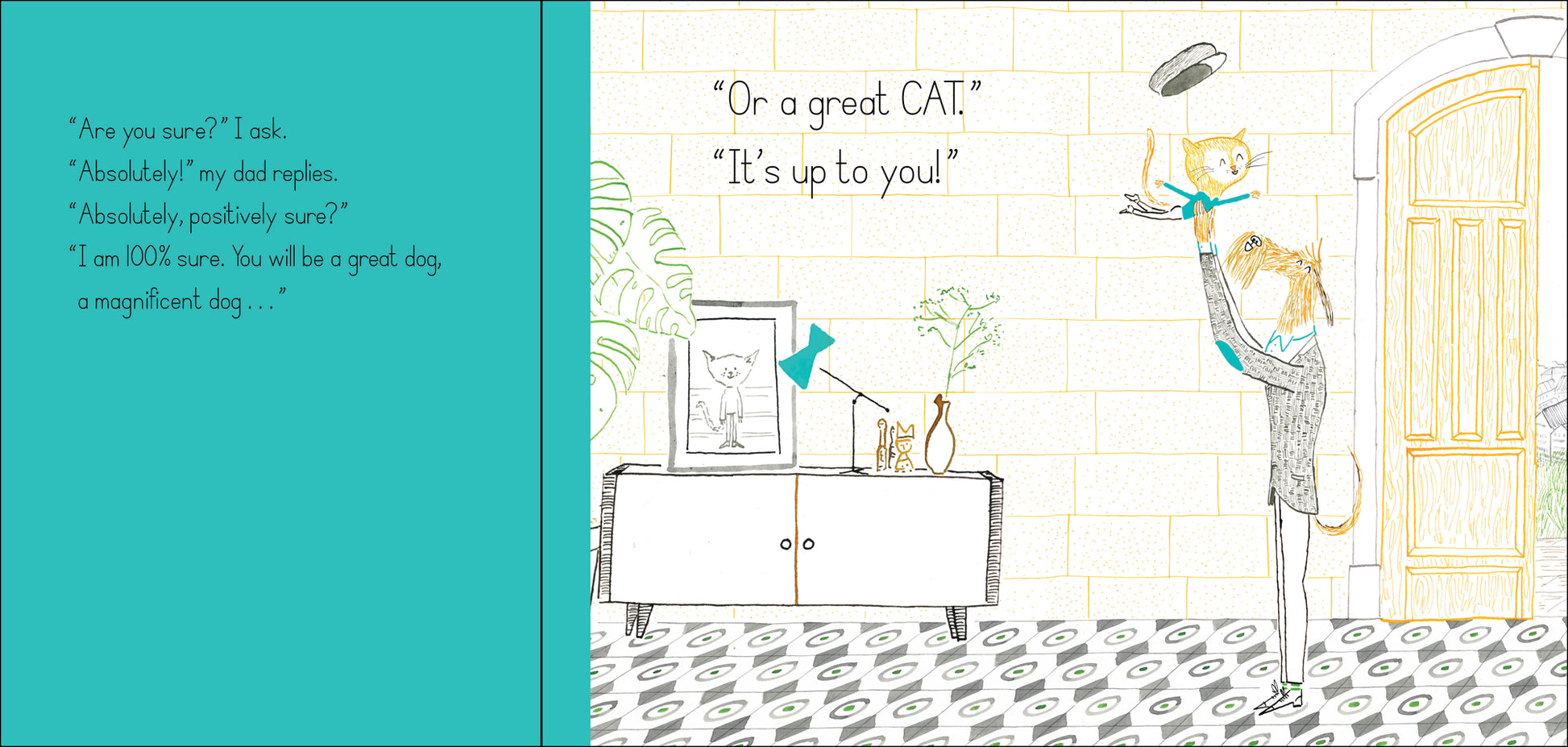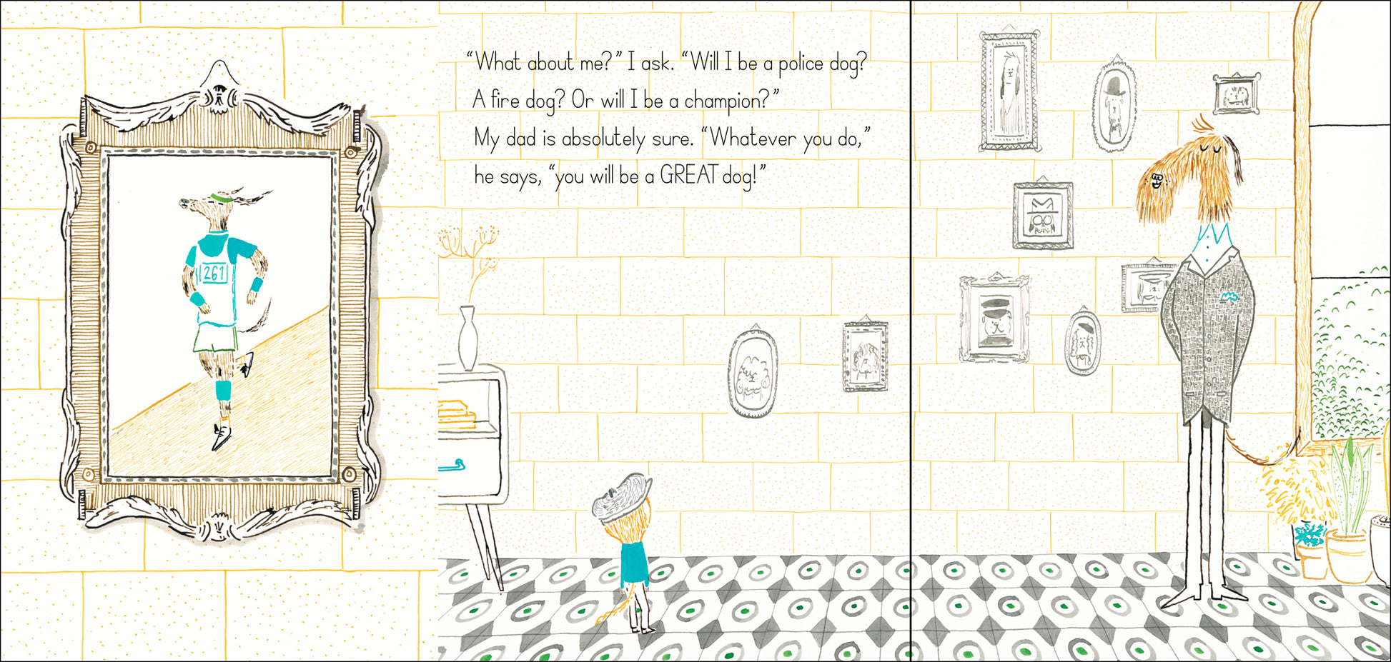 A pup and his father contemplate his grand future while looking at other Great Dogs in their family. Will he be a marathon runner like Uncle Tibor, the fastest dog in the family? Will he be an astronaut like Aunt Yuki, who reached for the stars? Or maybe a teacher like Uncle Scooter, respected by all? No matter what, says his father, he will be a GREAT dog!