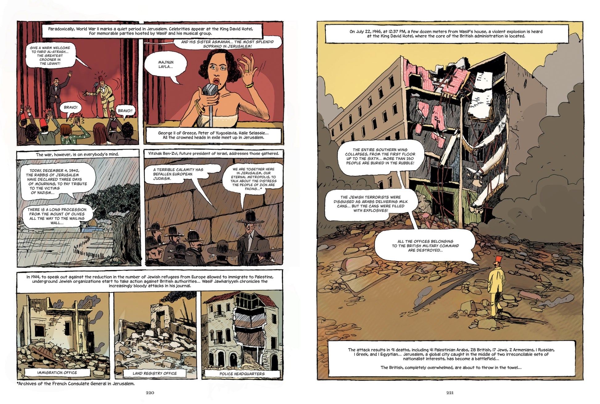 In this 256-page graphic novel, written by renowned historian Vincent Lemire and illustrated by cartoonist and animator Christophe Gaultier, readers will meet Abraham, King Herod, Empress Helena (the mother of Constantine I), Queen Melisende of Jerusalem, Saladin, Sulayman ibn Abd al-Malik ibn Marwan, General Edmund Allenby, Palestinian nationalist Abd al-Qadir al-Husayni, former Mayor Teddy Kollek, and many other famous people who have helped build the story of Jerusalem.
