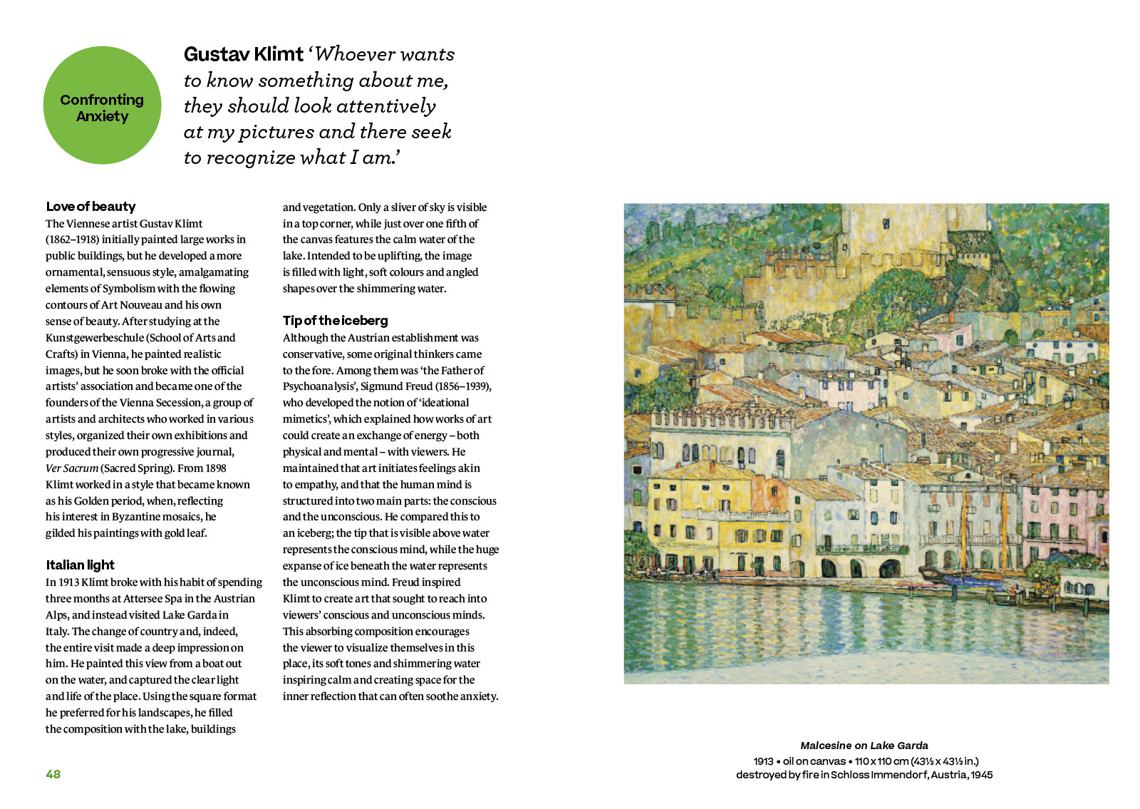 This guide introduces readers to new ways of looking at a wide range of art. Through careful examination and explanation, it investigates how engaging with art and drawing upon its ideas can help everyone feel connected and inspired. From Frida Kahlo confronting her anxieties to Henri Matisse embracing happiness, from Louise Bourgeois conquering fear to Auguste Rodin finding hope, it shows how you too can use art to work through difficult emotions and improve your mental wellbeing. Even art that unsettles can help us to think and feel differently.