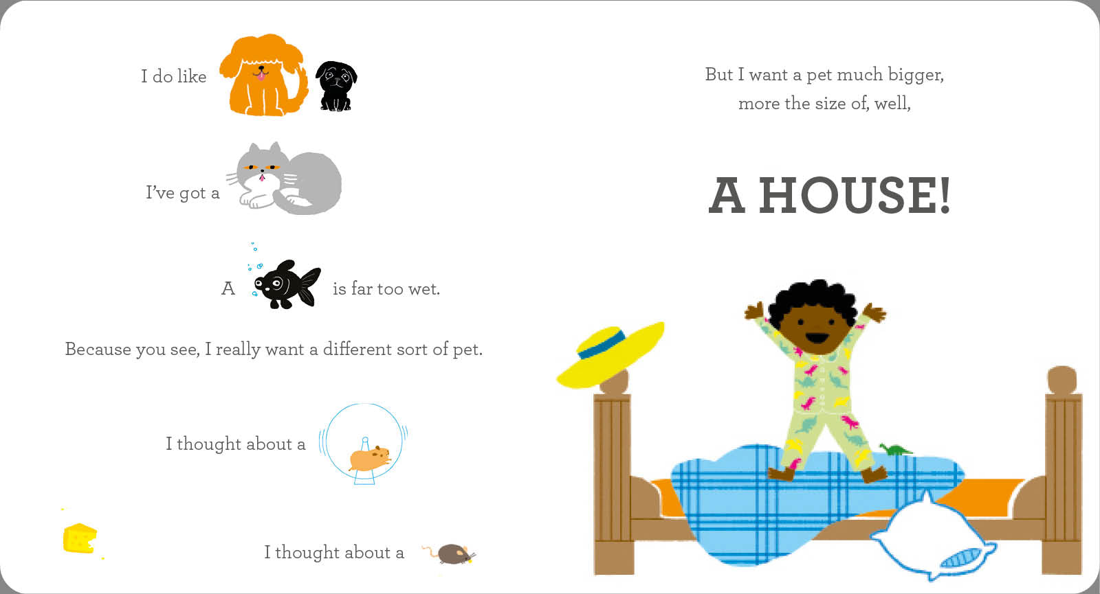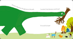 A little girl dreams of having her very own pet. But what kind of animal would make the best companion? A mouse is too small; a cat is too ordinary; and a fish is too... wet! As she plays with her toy dinosaur, inspiration strikes. What about a real, live dinosaur? She could ride it to school. It would need lots of food to eat, a swimming pool to drink from, and a dino flap so it could come and go. At the end of a day spent busily imagining, the girl trudges up to bed with her little plastic dinosaur. As she falls asleep, the dinosaur from her daydreams stands in the garden with its head poking through the bedroom window, making her dreams come true.