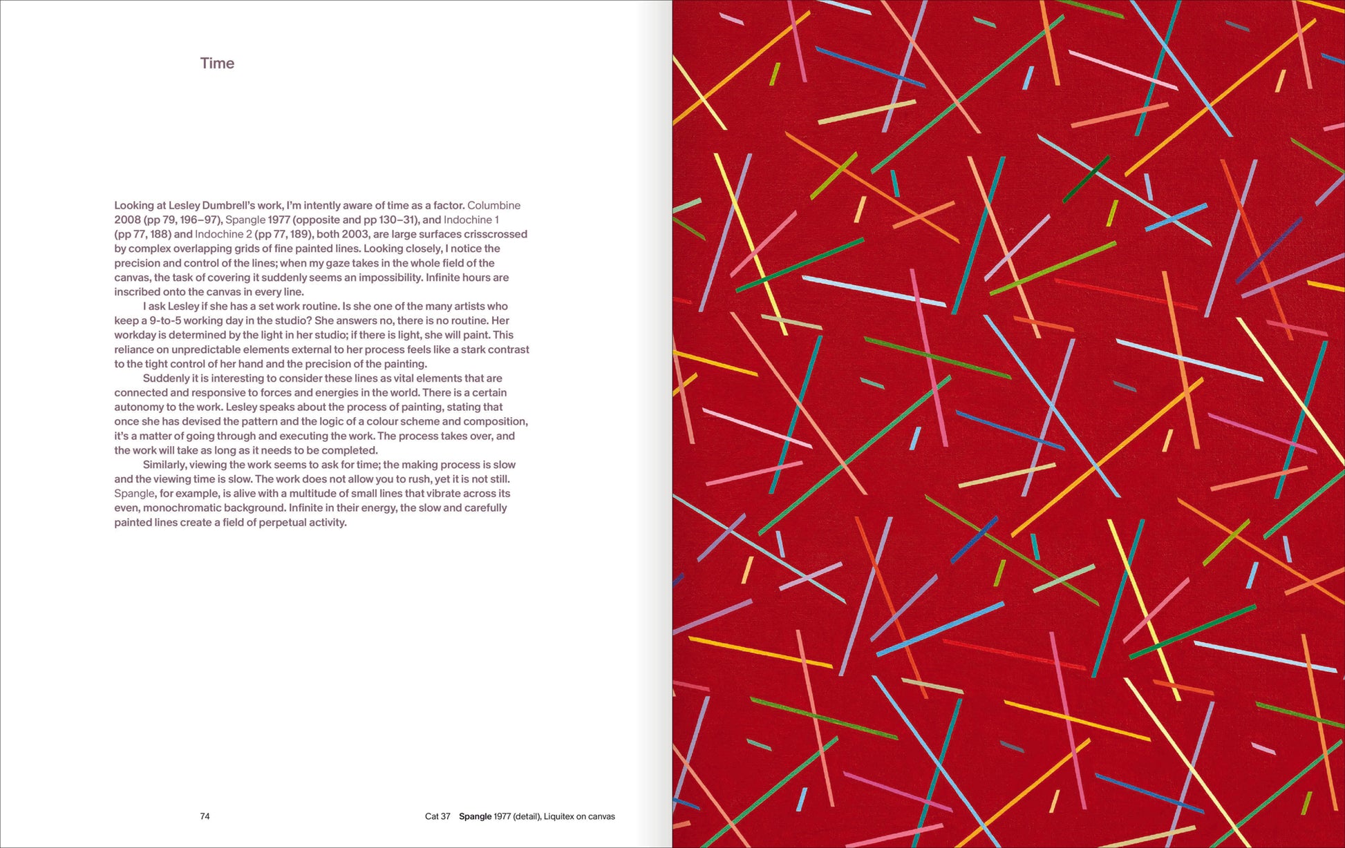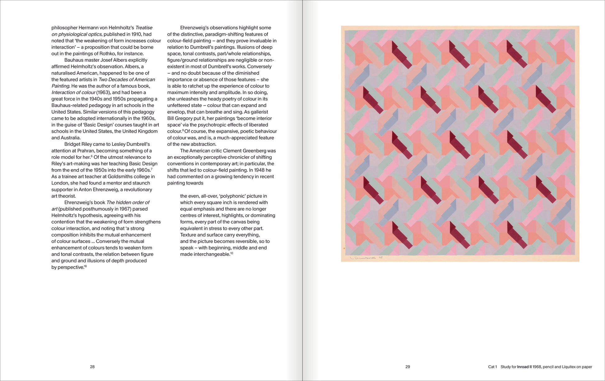 As a young woman, Dumbrell was inspired by the writings of Wassily Kandinsky and the work of Bridget Riley, whose paintings conveyed the power of abstract art to express memory and emotion, natural phenomena and human experience. Dumbrell's remarkable facility with colour and grasp of the organising power of the grid remain at the heart of her distinctive and exploratory abstraction, sustained over five decades of practice in Melbourne, the Strathbogie Ranges of northern Victoria, and Bangkok, Thailand.