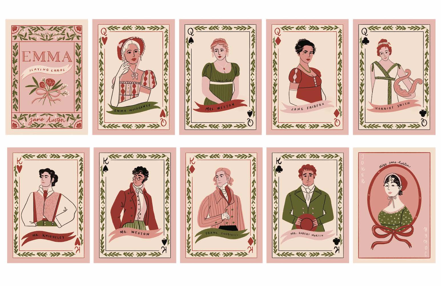 A three-deck playing card set based on Jane Austen’s classics and designed to look like mini books, with beloved characters for the face cards