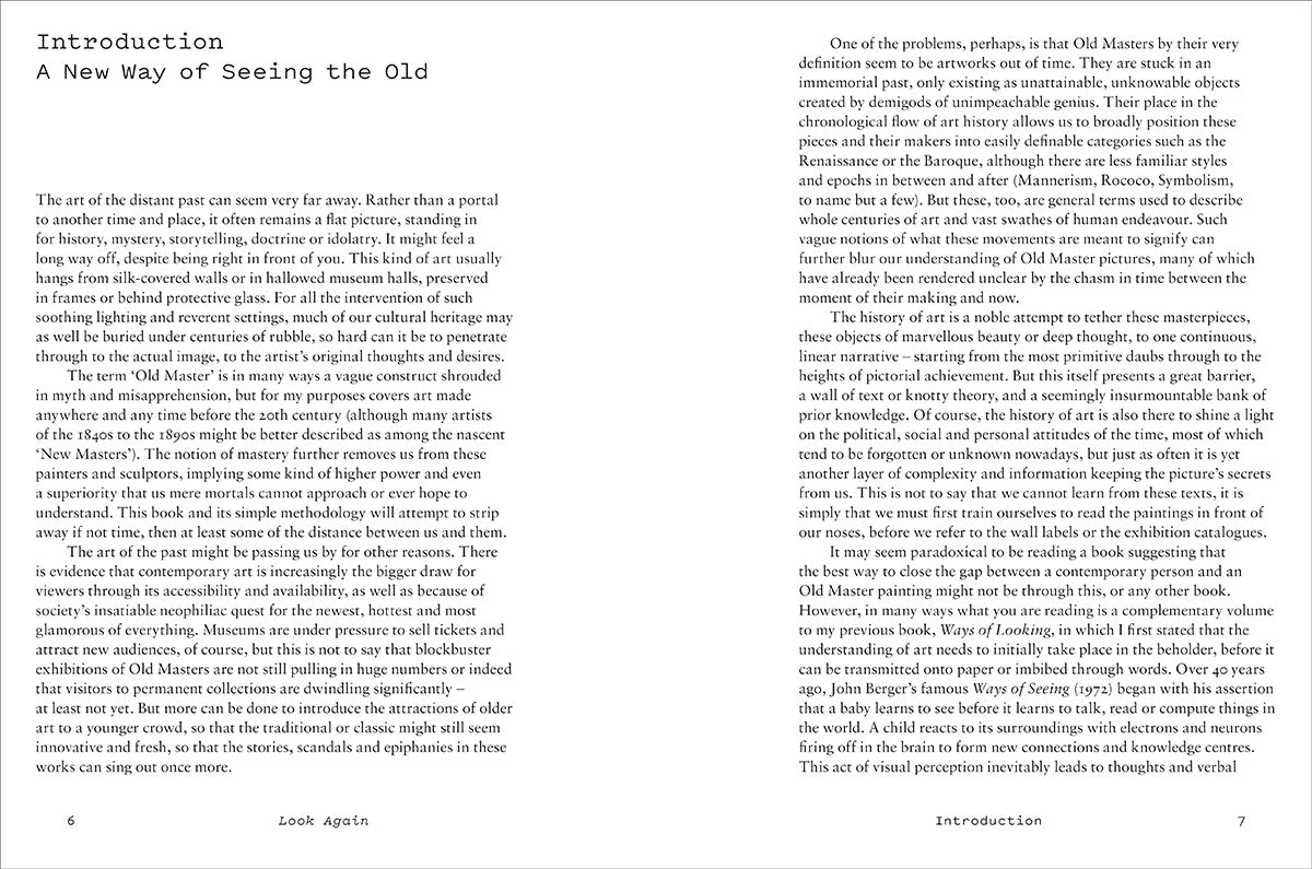 Look Again's novel approach is influenced by John Berger's Ways of Seeing, but is here updated for the art world of the 21st century. Key to this book is an emphasis on ways of experiencing Old Masters - more than just looking. Just as contemporary art should be judged by how it moves us, cajoles us and envelops us, so too can the great paintings of the world be seen as immersive, captivating, even participatory experiences.