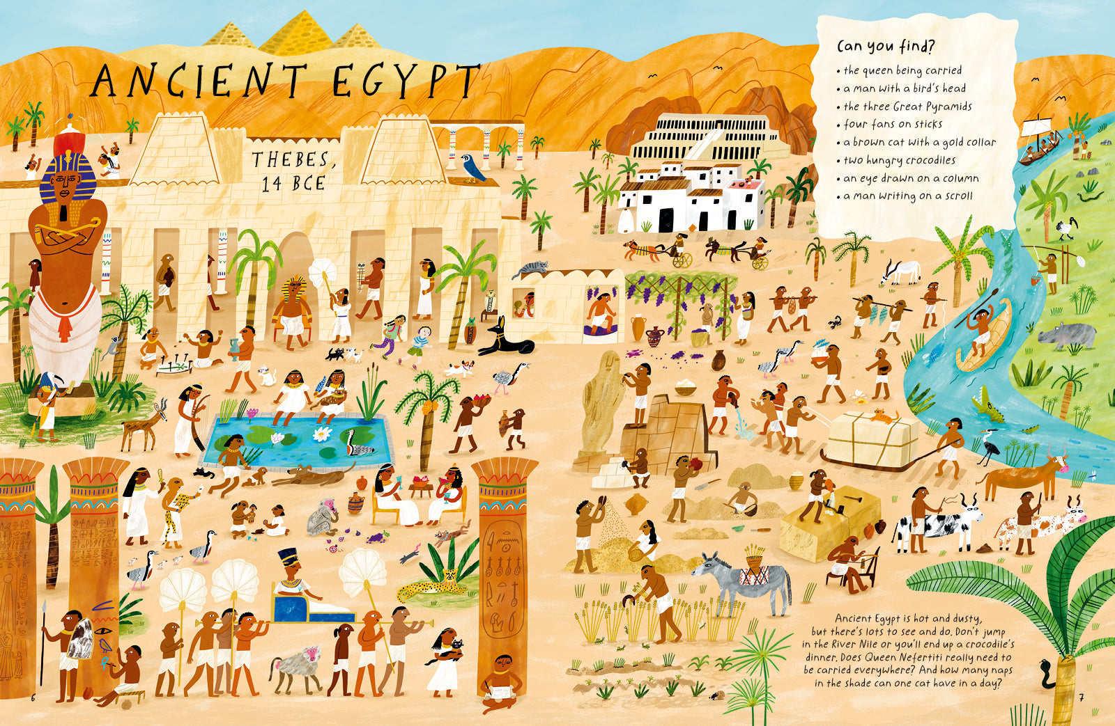 Readers will seek across nine amazing locations, from the palaces of ancient Egypt to the Roman Colosseum, the dirty streets of Tudor London to the chaos of the French Revolution, to discover key people and objects from the time and place, supported by well-researched and playfully told facts giving insight into what the reader has found. This is a tasty sample of world history that will delight young history lovers.