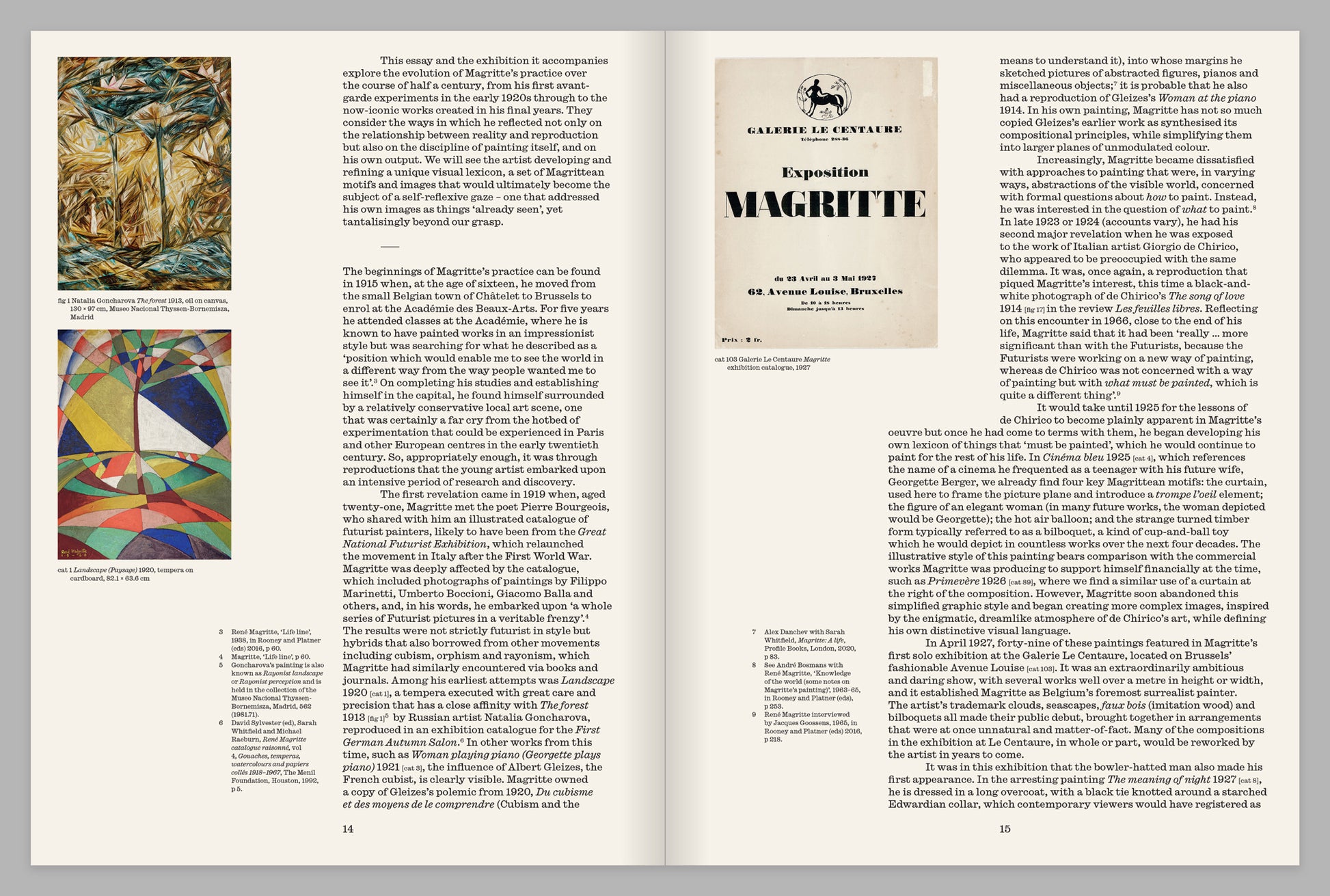 The book features reproductions of the 100+ works in the exhibition alongside rarely seen archival materials, commercial work and photography. The images are accompanied by four essays and an interview with Magritte (originally recorded for Belgian television in 1965), which together offer nuanced perspectives on the aesthetic foundations of his work while also considering the social and artistic context for his practice.