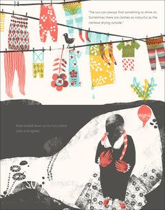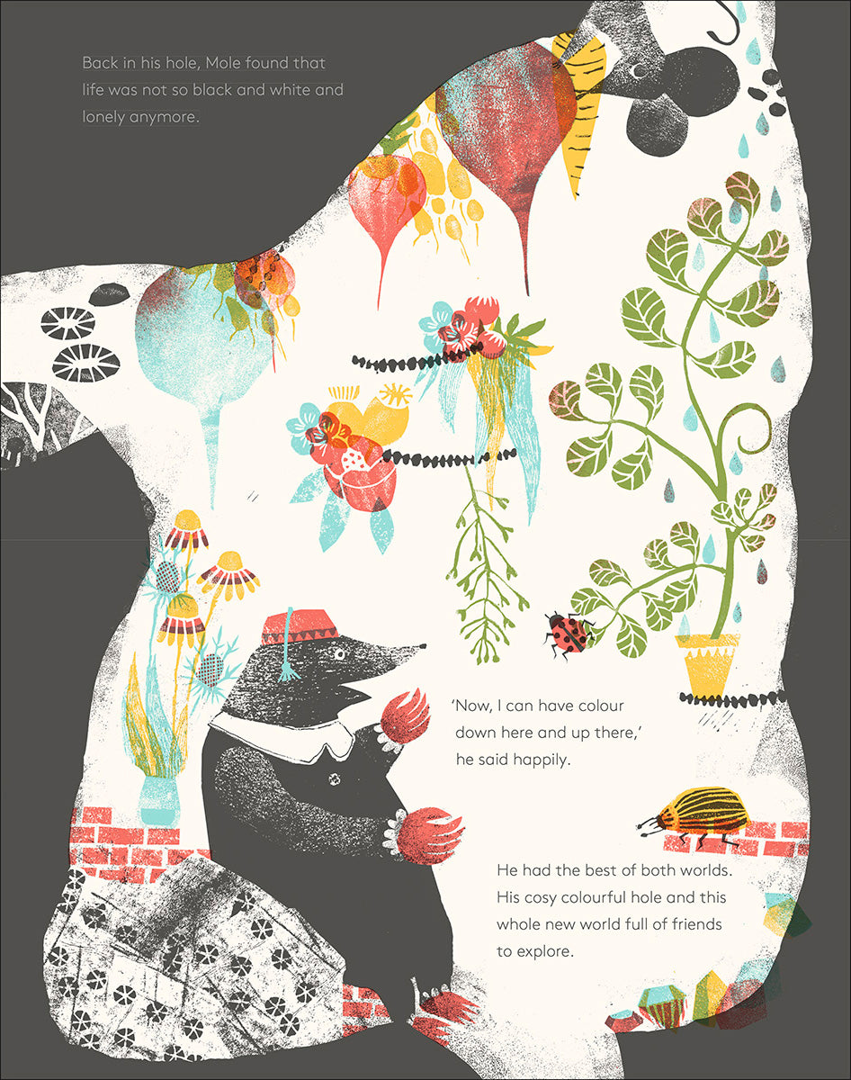 When Mole looks around his underground home, all he sees is the black-and-white world of his cold, dark hole. Mole digs and digs, dreaming of finding something colourful, but day after day, he is disappointed. One day, Mole finds a radish poking through the top of his tunnel like a chandelier. They start chatting, and as Mole listens to the descriptions of life above ground, he imagines bright clothes, red roofs, vibrant green trees, pastel flowers and the blush of the sun as it sinks through the sky. The next morning, Mole is distraught to discover that his chandelier is gone, leaving a hole in its place. He crawls out of the hole and into the world above - and into a place more colourful than he ever dreamed possible.