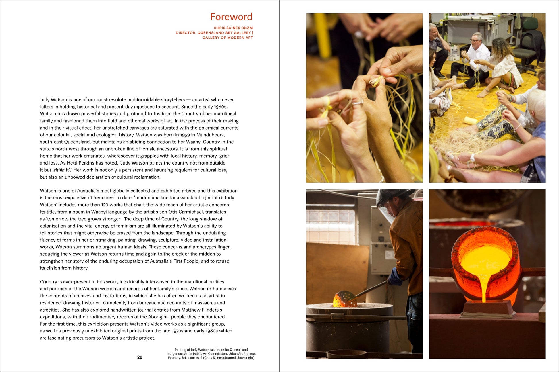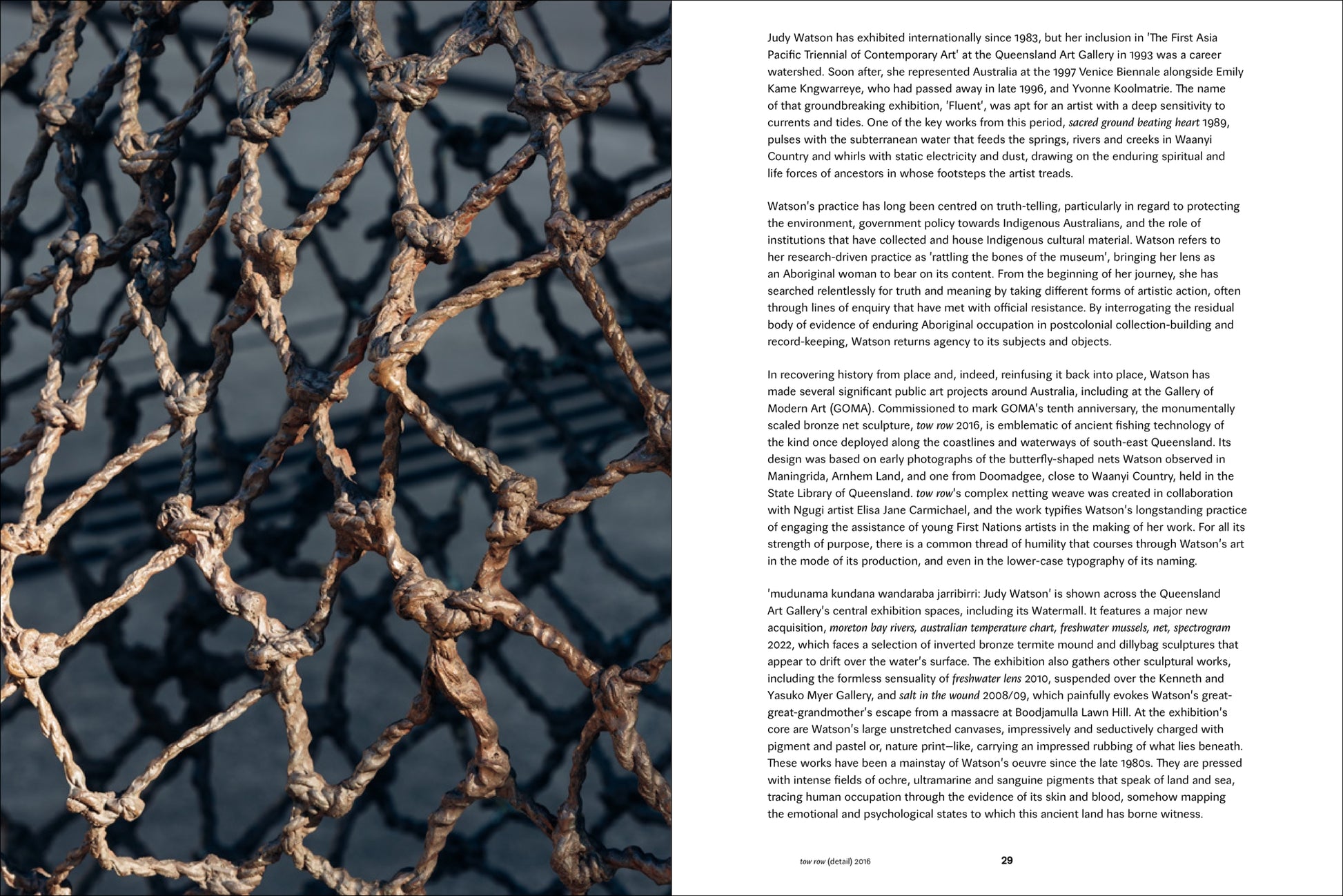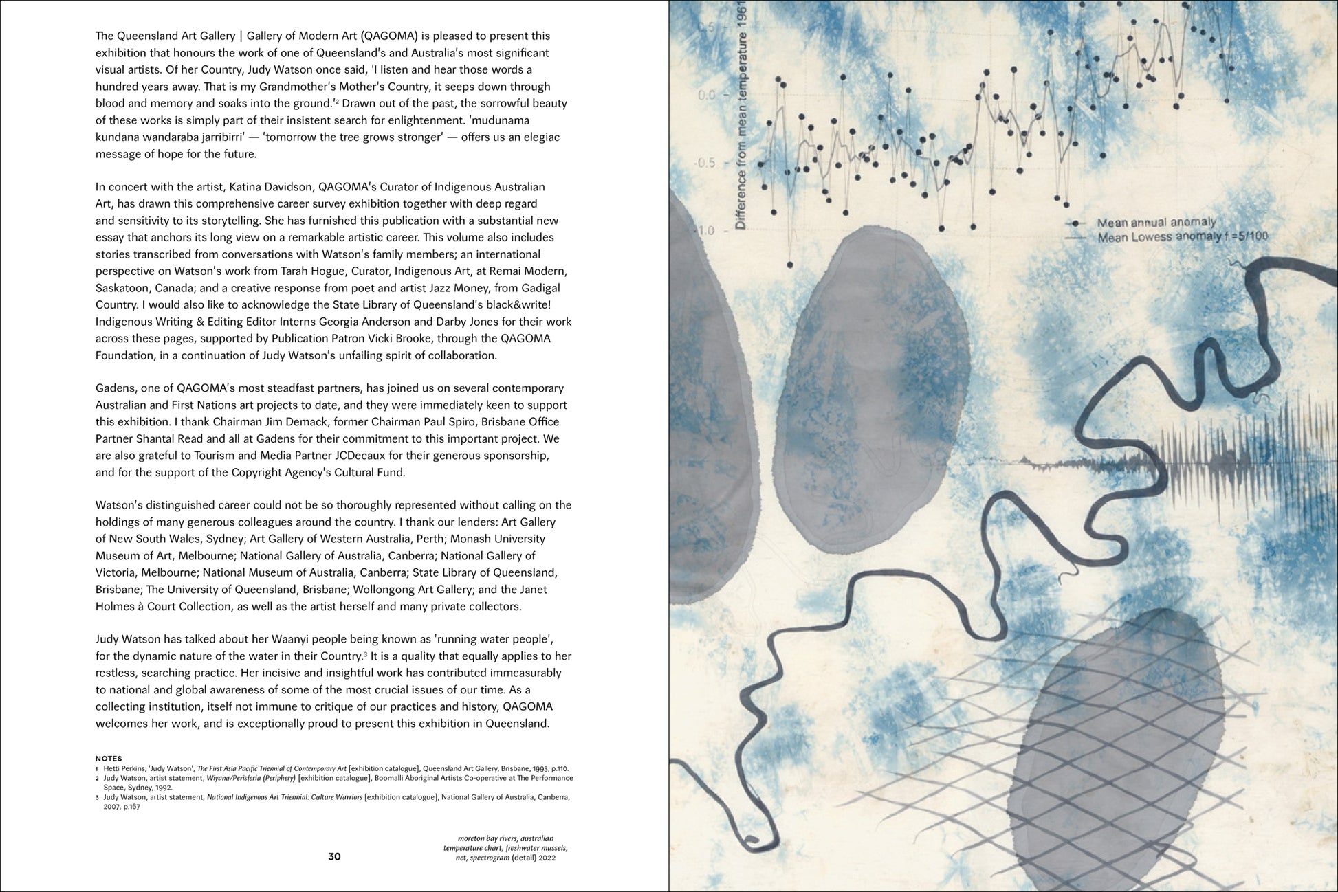 This beautifully designed hard-cover book features an in-depth examination of Watson's practice and biography by curator Katina Davidson; essay on Watson's international significance by Métis curator Tarah Hogue; interview with and photographs of family members; creative response to Watson's work by Wiradjuri poet Jazz Money; and a map of north-west Queensland and photographs of sites of significance to aid audience's understanding of the connections between Watson's work and Country. It also features an up-to-date Exhibition history and Selected bibliography.