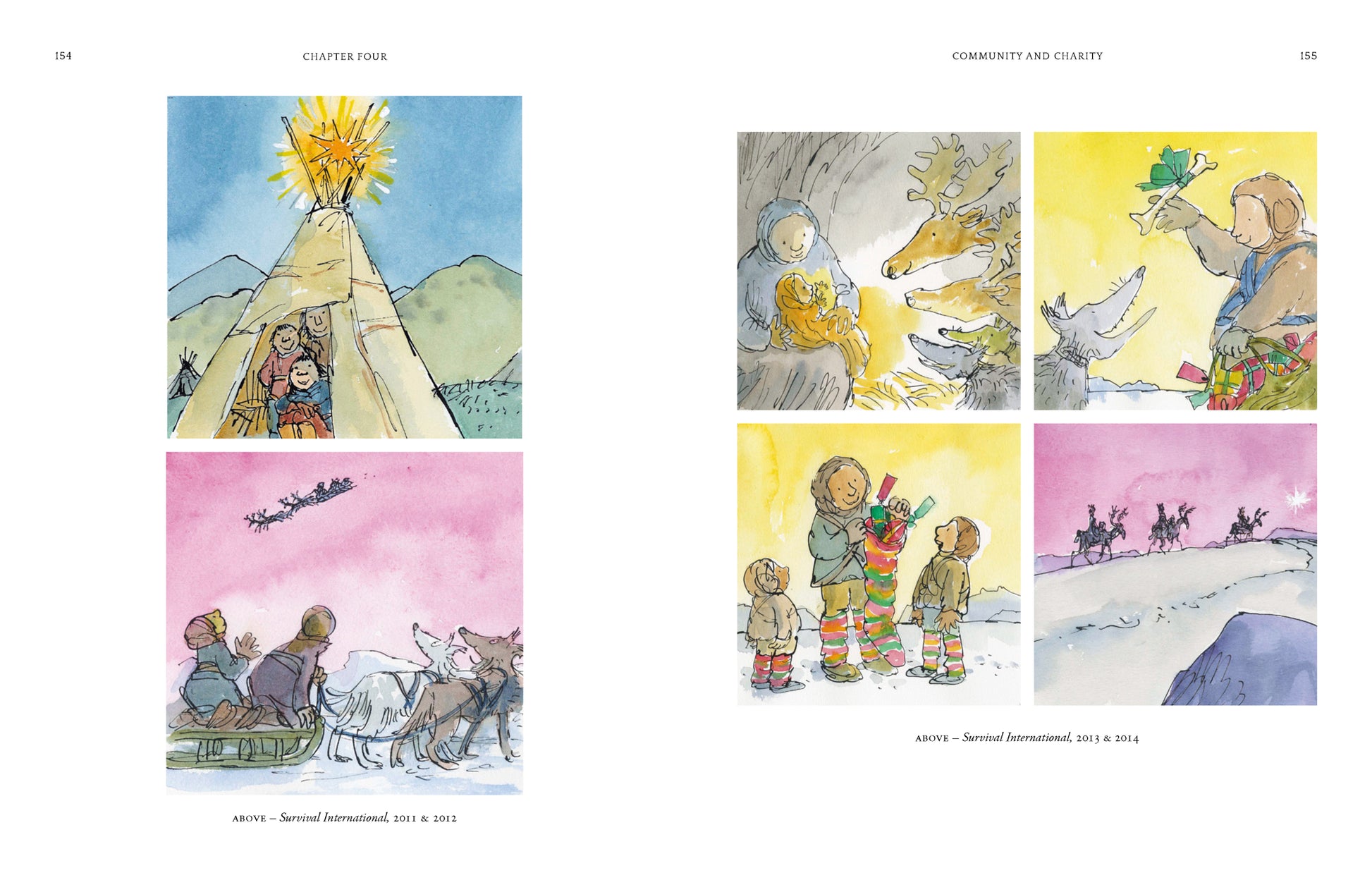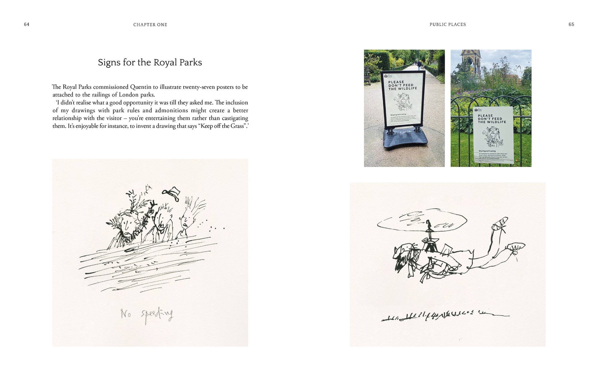 The work here shows Quentin using this vernacular to great effect and for very different purposes. In 2007 when Elizabeth II was opening the new Eurostar at St Pancras, Quentin was asked to hide an unsightly building across the road. He drew a 2-colour illustration on his drawing board showing a cast of characters that you might meet on a London Street; this was then blown up large enough to wrap a five-storey building. Since then he has found other opportunities for site specific work. Here are beautiful drawings of new-borns, mothers and fathers in a maternity hospital in France. Some images were etched, larger than life-size, on the external glass of the building as well as used in corridors and delivery suites. Most recently Quentin has done a series of drawings of everyday life for the family rooms for prisons across the UK. And charities have benefited from Quentin's enjoyment of drawing for a purpose; the Roald Dahl Marvellous Charity's logo and cards; for Comic Relief's two virtual pantomimes during lockdown, he drew the scene changes for Cinderella and Beauty and the Beast which were then auctioned; he created a rainbow for the NHS trust mug, and posters for Islington Libraries to encourage reading.