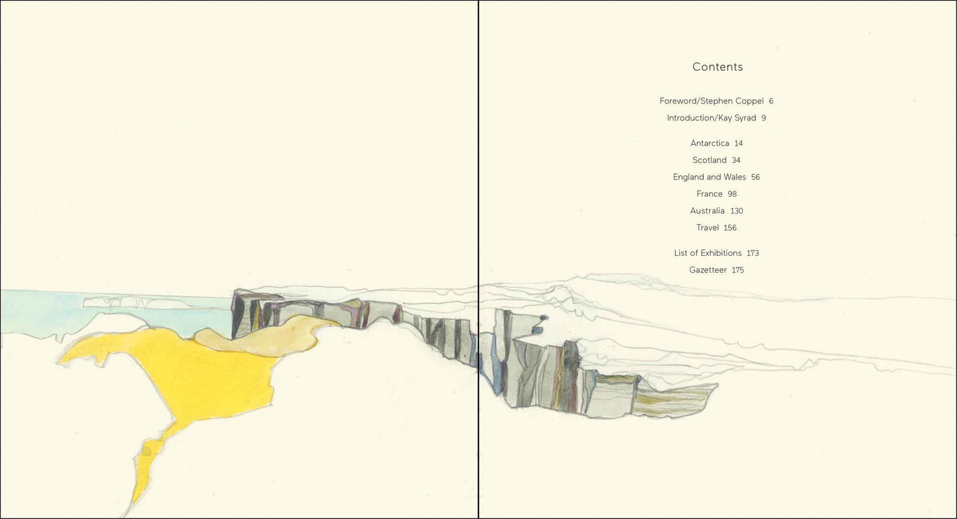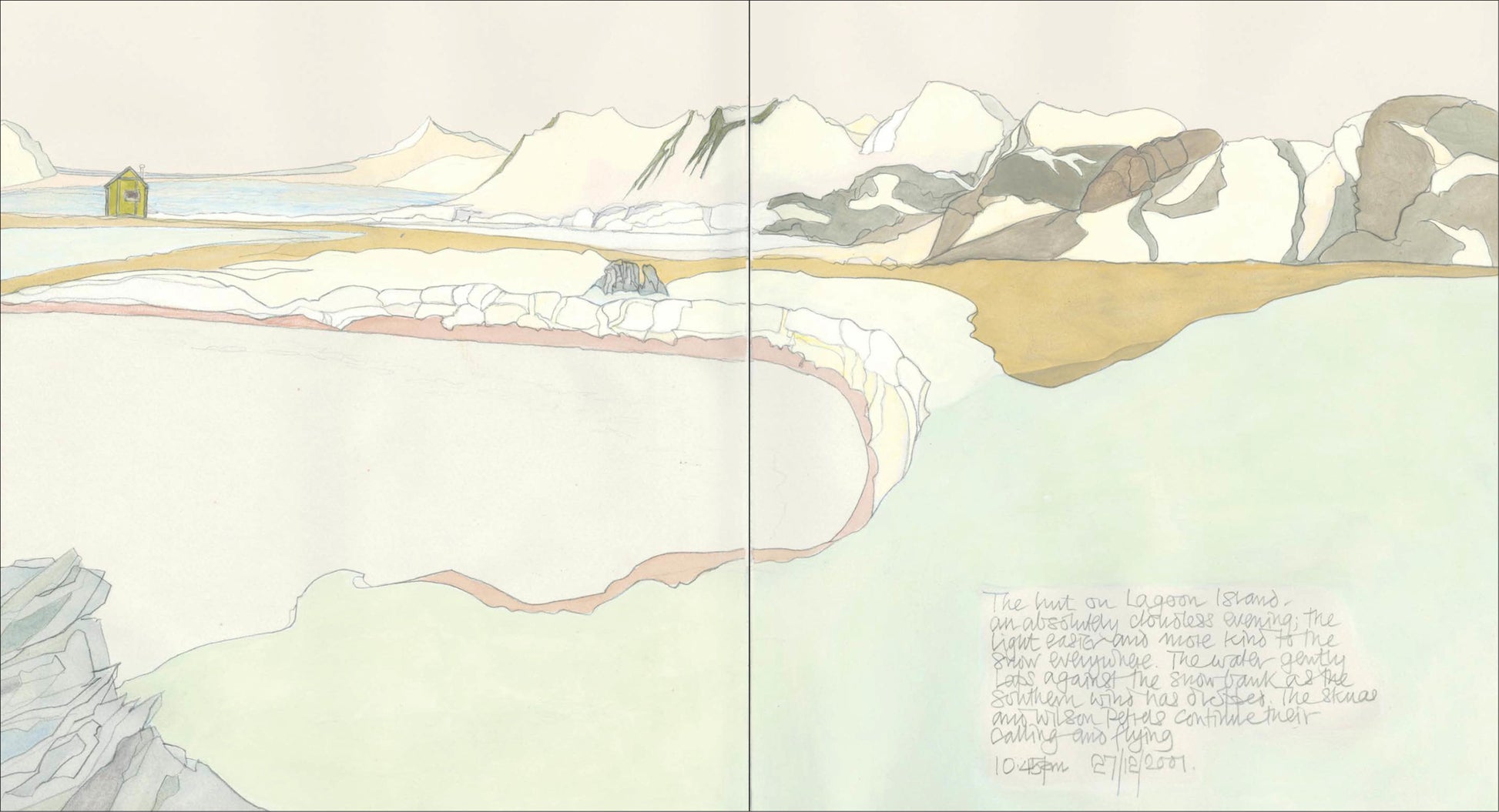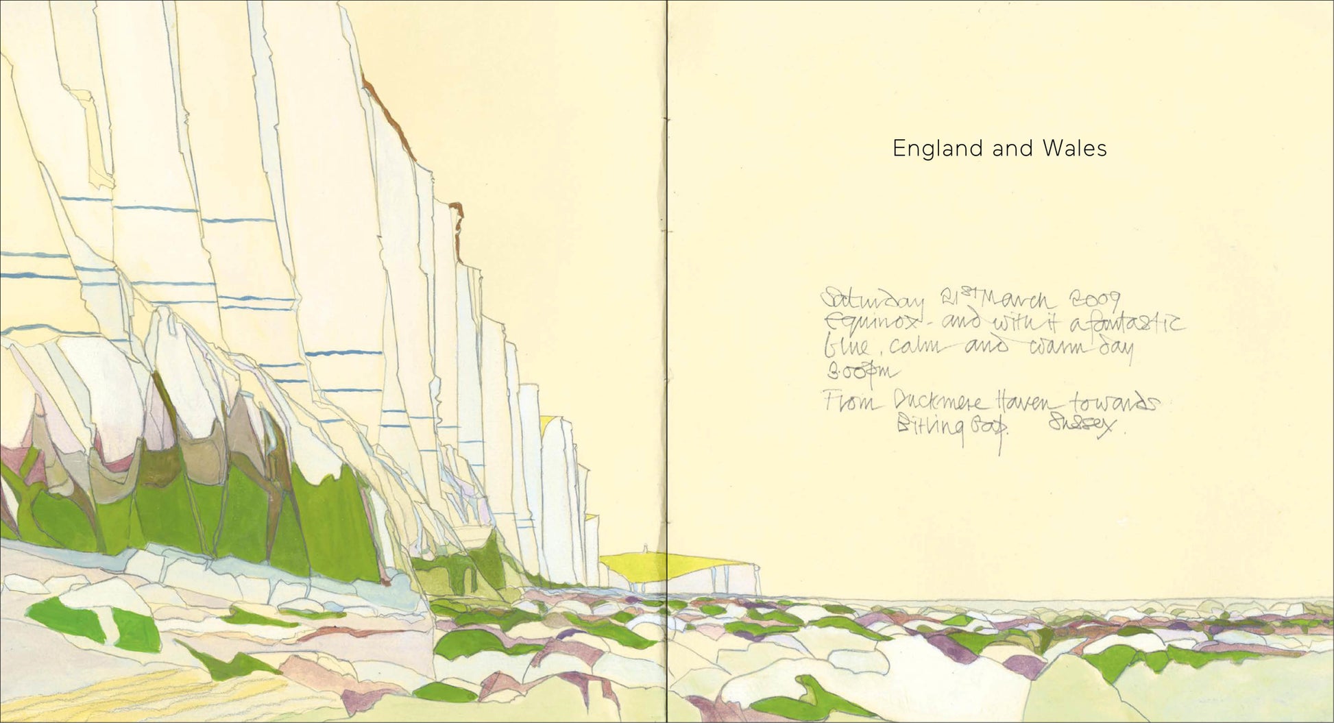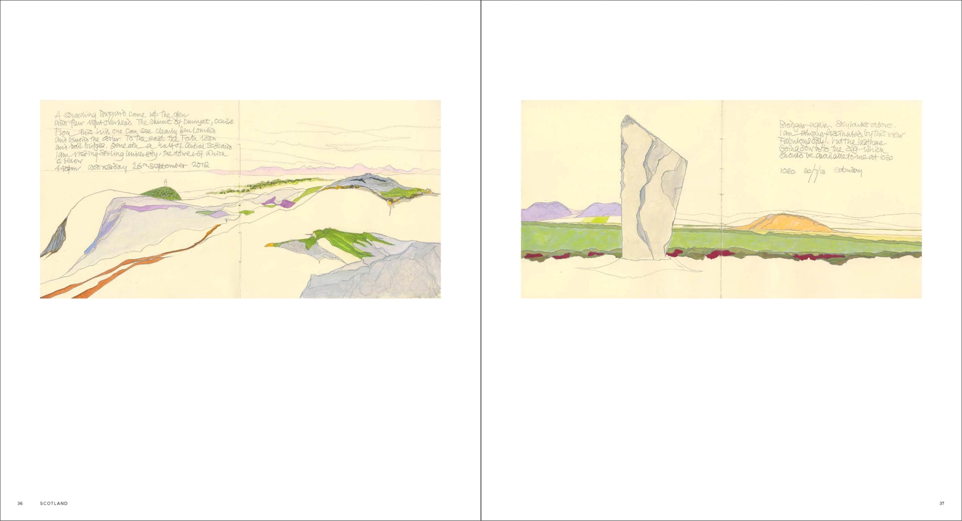 These painterly but topographically precise notebooks record moments when the artist has been moved to draw what he can see, whether from the shelter of a standing stone in Orkney, Scotland, from the air over the Simpson desert in Australia, or from a postal boat sailing through the Norwegian fjords.