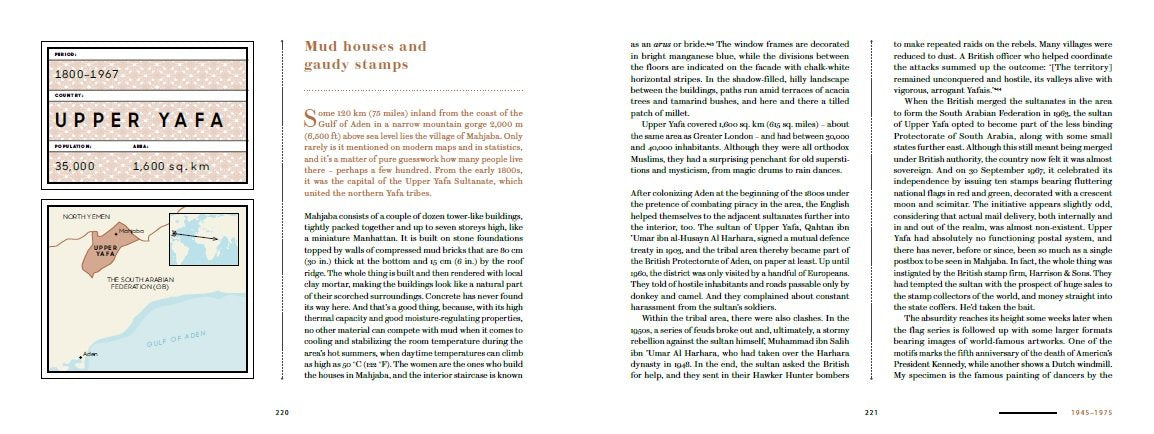 These are the stories of fifty countries that once existed - however briefly - but have now have been erased from the map. Varying vastly in size and shape, location and longevity, they are nonetheless united by one fact: all of them endured long enough to issue their own stamps.