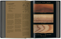 Arranged in alphabetical order, each tree is broken down into three different cross-section cuts of wood (radial, horizontal, and tangential), demonstrating the particular characteristics of the grain and the wealth of colors and textures to be found among the many different wood types.