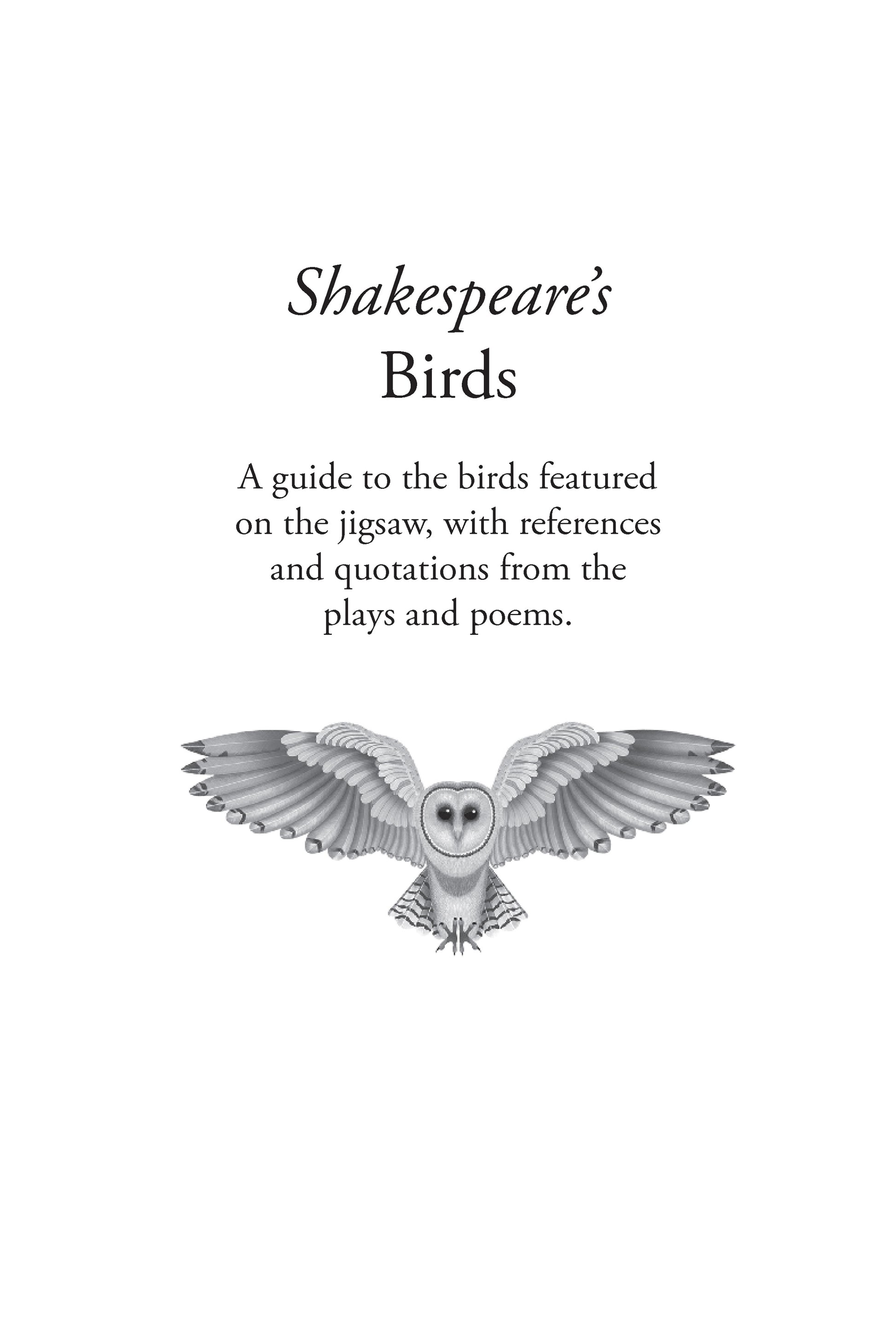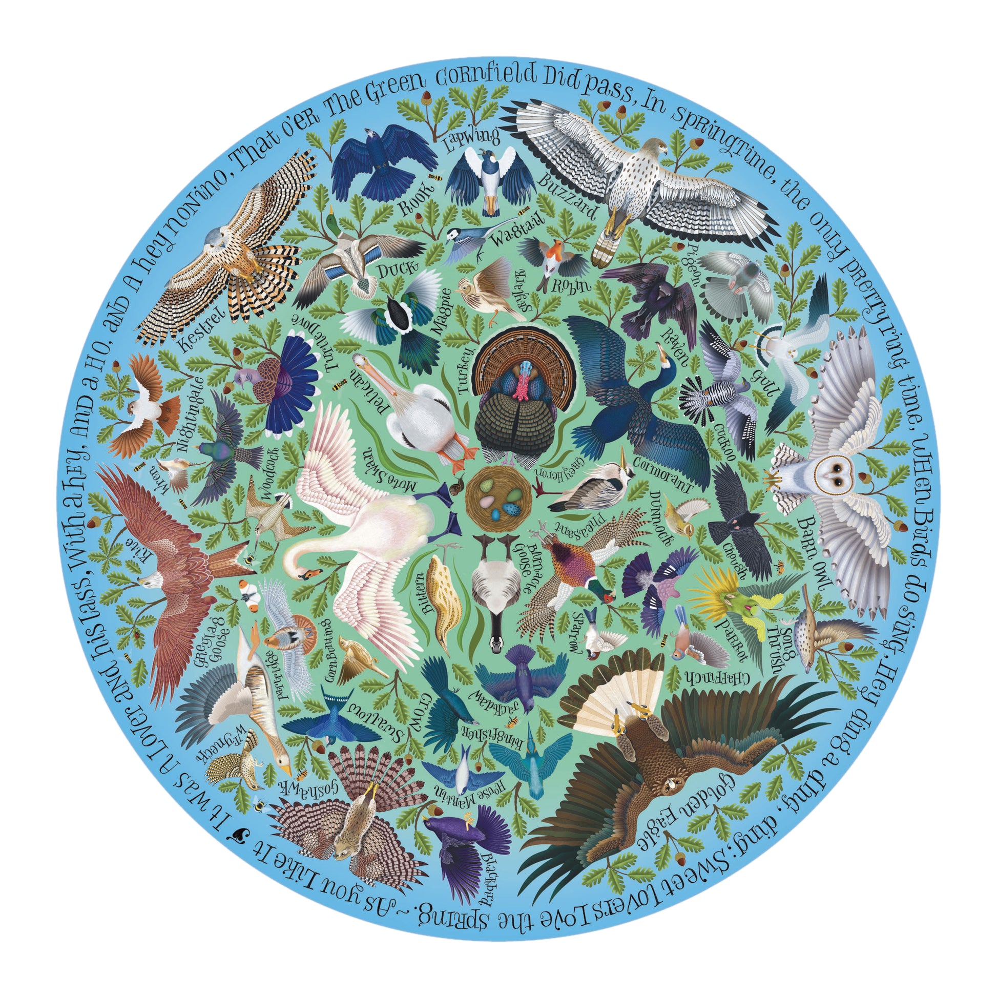 Shakespeare knew his birds, and frequently referred to them in his works: 64 species, on 606 occasions. This beautiful circular puzzle celebrates that legacy. Each species is captioned in Rebecca Harris' distinctive hand lettering, and around the circumference runs a longer bird-themed quotation from As You Like It.