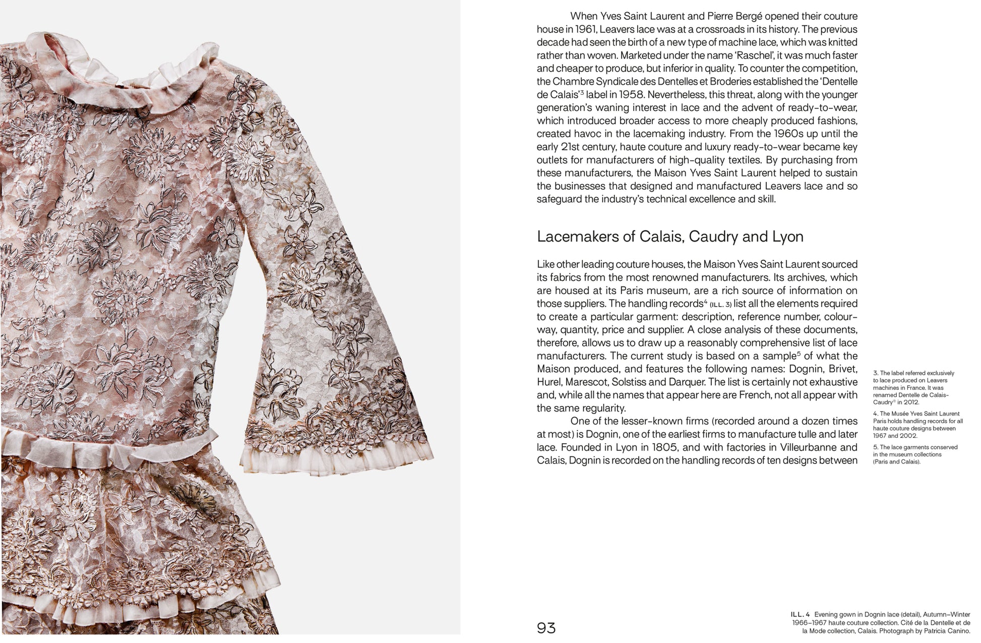 Patricia Canino is a photographer and filmmaker based in Paris. Émilie Hammen is Professor of Fashion History & Theory at Institut Français de la Mode. Shazia Boucher is Curator and Deputy Director at Cité de la Dentelle et de la Mode, Calais. Domitille Éblé, Judith Lamas and Alice Coulon-Saillard all work at the Musée Yves Saint Laurent Paris. Sophie Henwood is Collections Manager at Cité de la Dentelle et de la Mode, Calais. Anne-Claire Laronde is Director at Cité de la Dentelle et de la Mode, Calais.