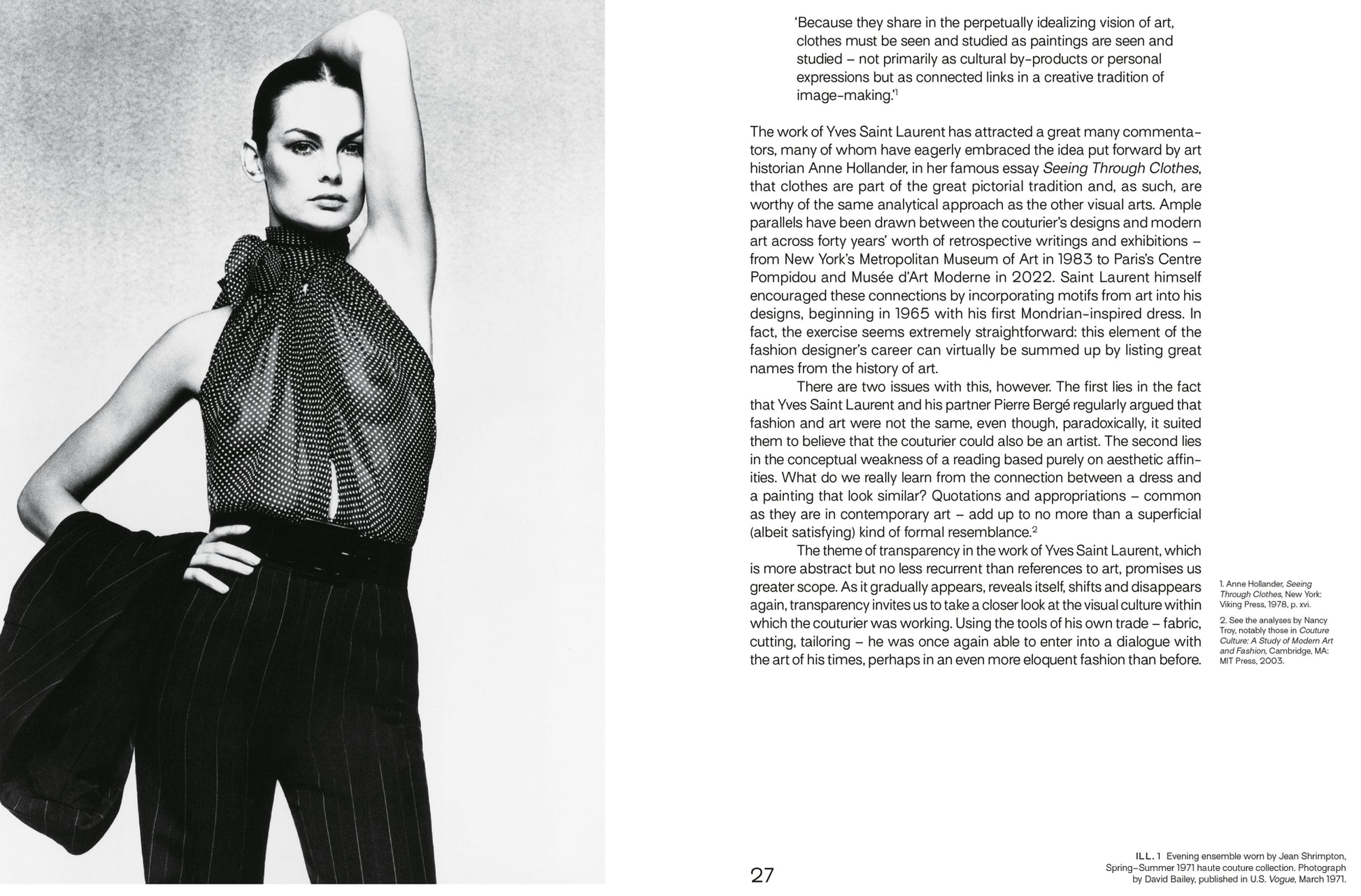 Through archival drawings and photographs, and newly shot sheer silhouettes designed by Yves Saint Laurent from the collections of the Musée Yves Saint Laurent Paris and the Museum for Lace and Fashion, Calais, Sheer: The Diaphanous Creations of Yves Saint Laurent highlights the couturier's pioneering work in lace and other sheer fabrics, uncovering how he was able to overturn codes of unveiling the body to present a new, powerful and sensual feminine figure.