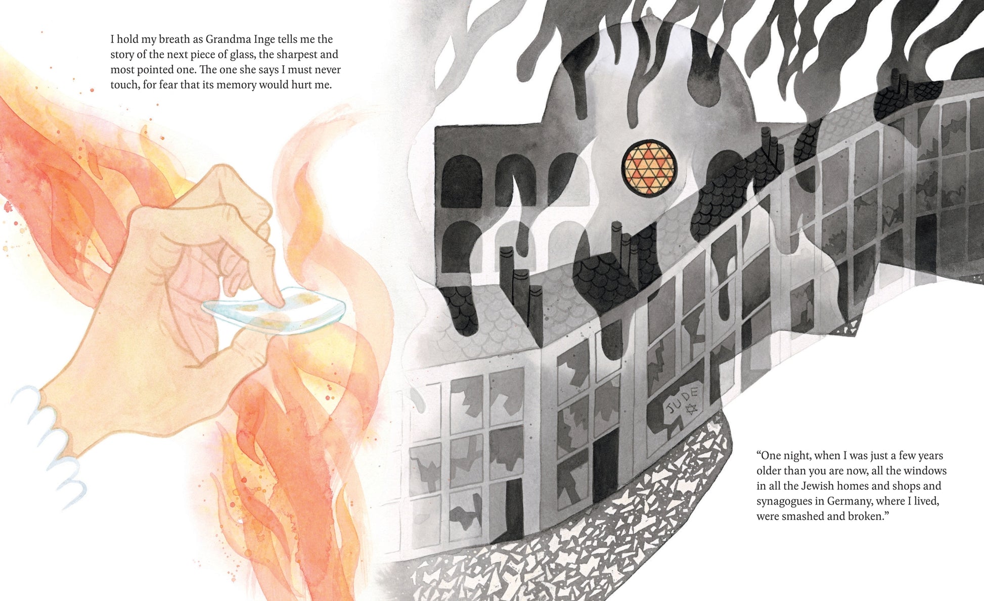 When Inge’s great-granddaughter asks why Inge has kept these shards, she learns decades-old stories from her great-grandmother’s life—from the joy of glass breaking at her wedding to harrowing reminders of smashed windows during Kristallnacht. And she comes to understand why we hold onto our memories both happy and sad.